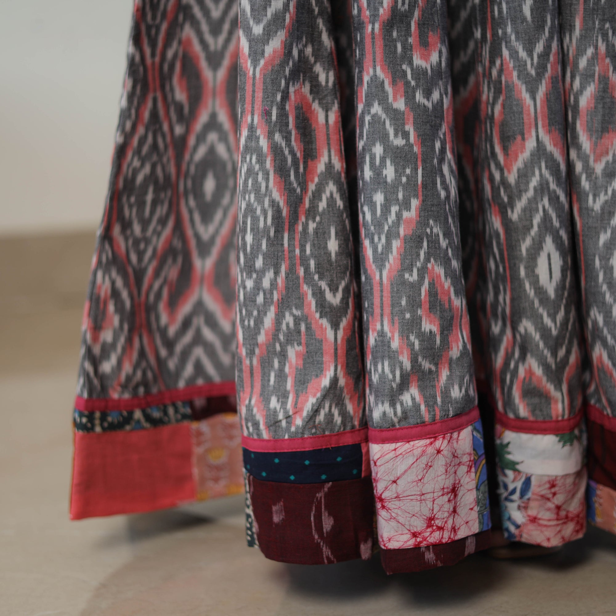 Elevate your wardrobe with this handcrafted 24 kali cotton grey pochampally ikat skirt with Patchwork border. Celebrating the rich heritage of Pochampally weaving this skirt combines traditional craftsmanship with modern elegance. The intricate Ikat patterns are meticulously created using hand-dyeing techniques reflecting the artisanal skill passed down through generations. Made from breathable eco-friendly cotton it offers a perfect fit with its adjustable tie-up waist closure. The patchwork border adds a unique touch making this skirt a versatile piece for festive occasions or casual outings.