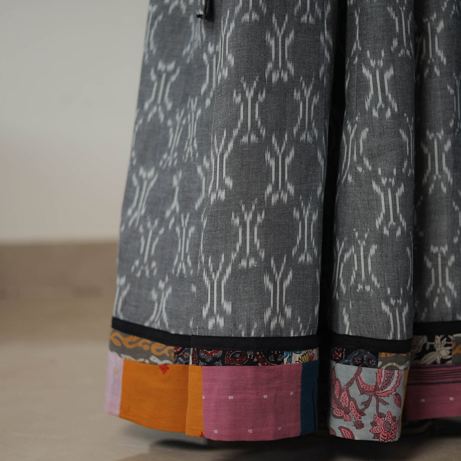 Elevate your wardrobe with this handcrafted 24 kali grey cotton pochampally ikat skirt with Patchwork border. Celebrating the rich heritage of Pochampally weaving this skirt combines traditional craftsmanship with modern elegance. The intricate Ikat patterns are meticulously created using hand-dyeing techniques reflecting the artisanal skill passed down through generations. Made from breathable eco-friendly cotton it offers a perfect fit with its adjustable tie-up waist closure. The patchwork border adds a unique touch making this skirt a versatile piece for festive occasions or casual outings.
