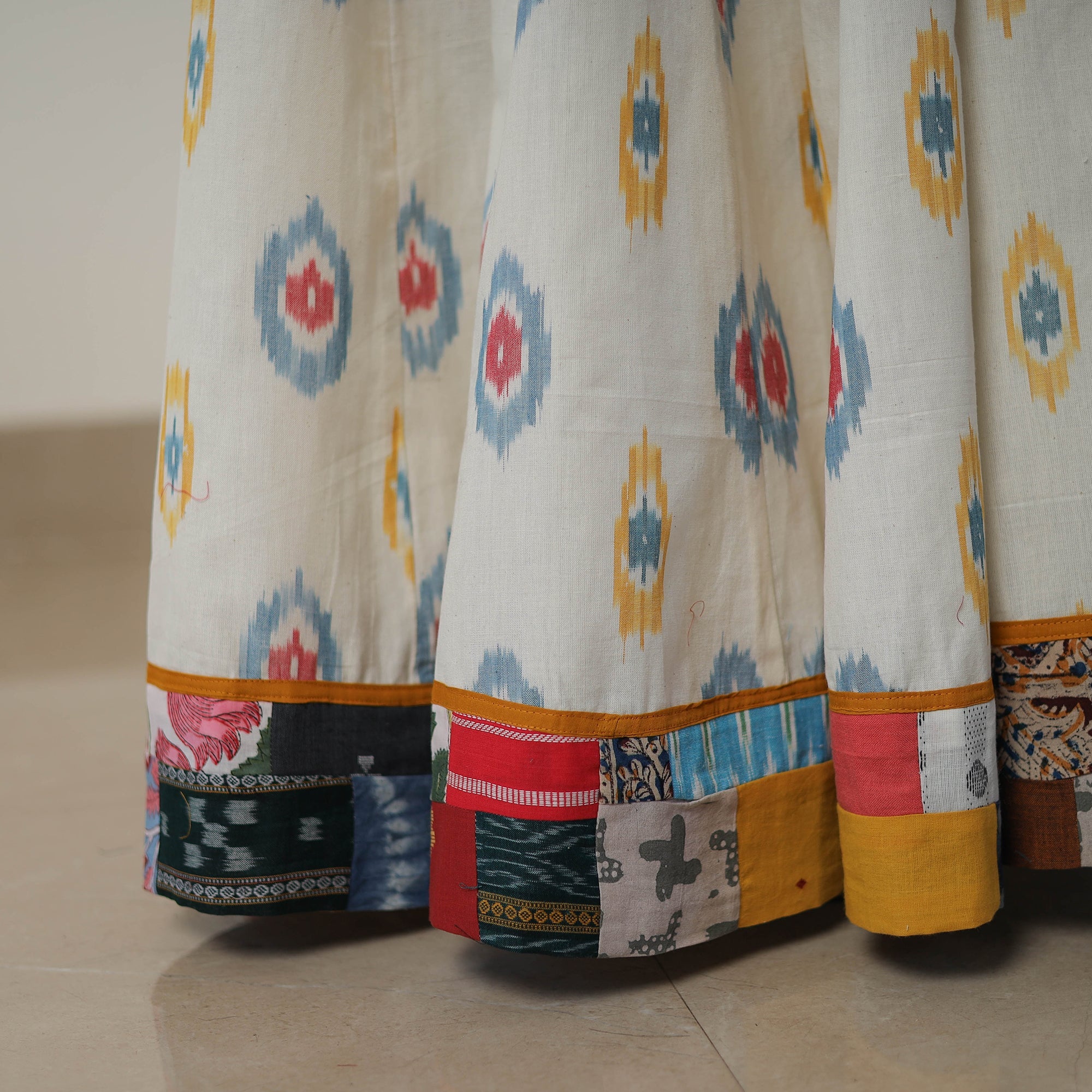 Elevate your wardrobe with this handcrafted 24 kali white cotton pochampally ikat skirt with Patchwork border. Celebrating the rich heritage of Pochampally weaving this skirt combines traditional craftsmanship with modern elegance. The intricate Ikat patterns are meticulously created using hand-dyeing techniques reflecting the artisanal skill passed down through generations. Made from breathable eco-friendly cotton it offers a perfect fit with its adjustable tie-up waist closure. The patchwork border adds a unique touch making this skirt a versatile piece for festive occasions or casual outings.
