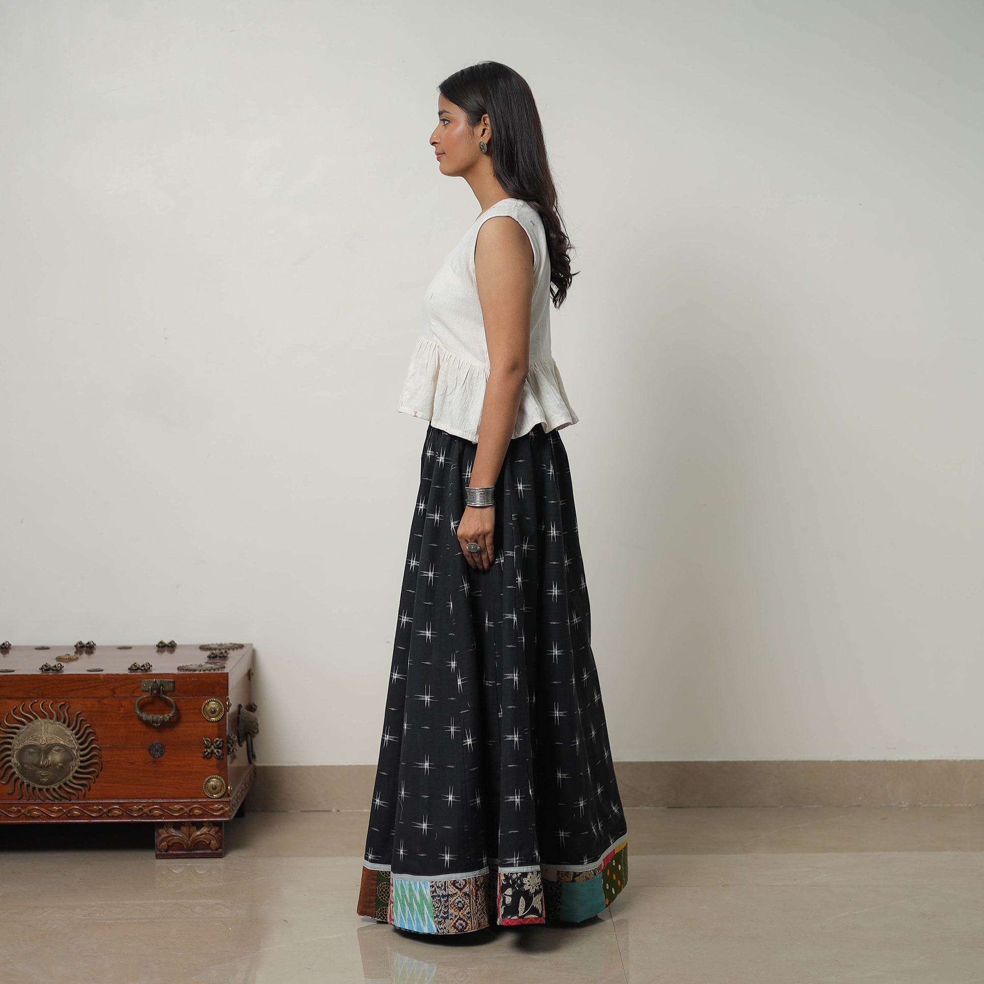 Elevate your wardrobe with this handcrafted 24 kali black cotton pochampally ikat skirt with Patchwork border. Celebrating the rich heritage of Pochampally weaving this skirt combines traditional craftsmanship with modern elegance. The intricate Ikat patterns are meticulously created using hand-dyeing techniques reflecting the artisanal skill passed down through generations. Made from breathable eco-friendly cotton it offers a perfect fit with its adjustable tie-up waist closure. The patchwork border adds a unique touch making this skirt a versatile piece for festive occasions or casual outings.