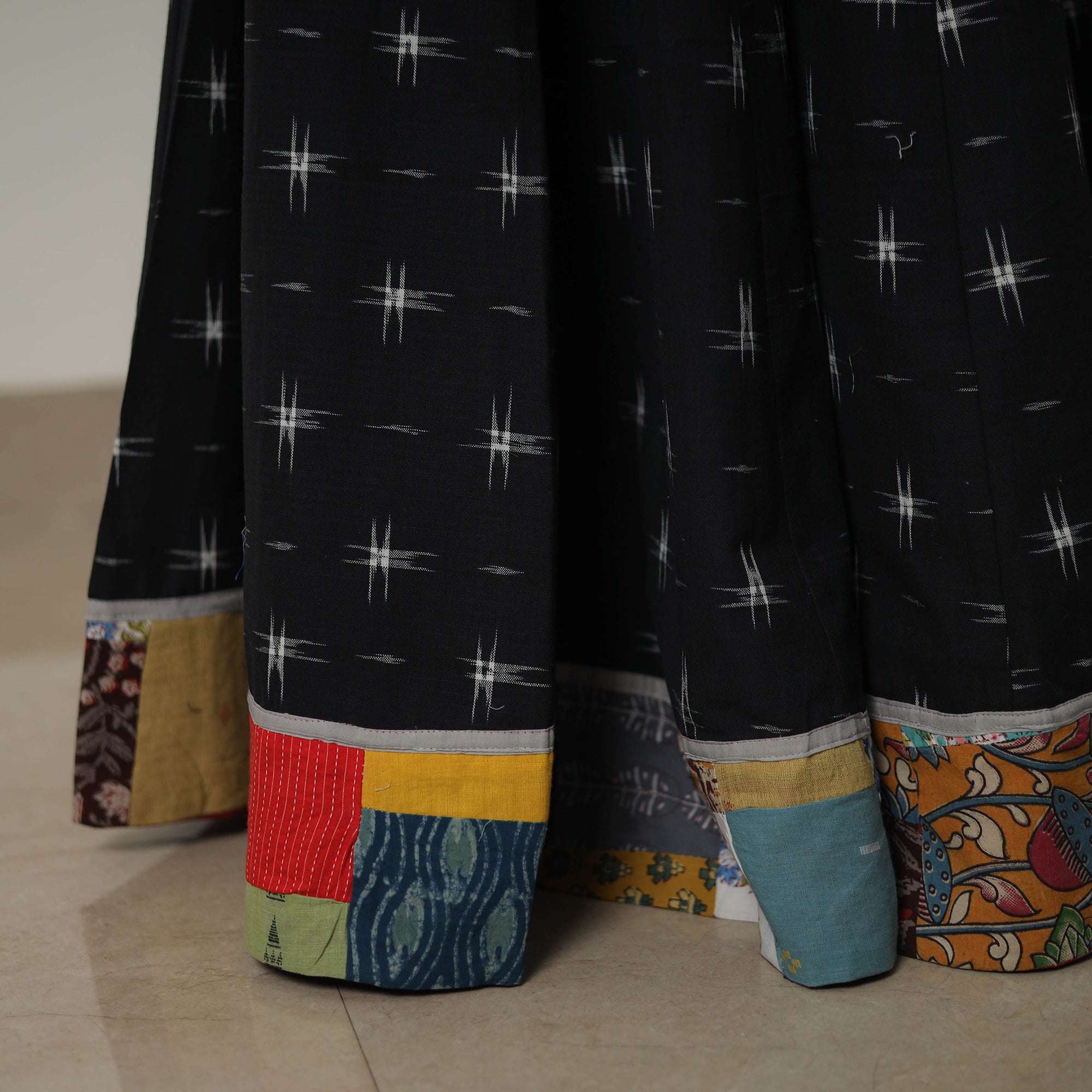 Elevate your wardrobe with this handcrafted 24 kali black cotton pochampally ikat skirt with Patchwork border. Celebrating the rich heritage of Pochampally weaving this skirt combines traditional craftsmanship with modern elegance. The intricate Ikat patterns are meticulously created using hand-dyeing techniques reflecting the artisanal skill passed down through generations. Made from breathable eco-friendly cotton it offers a perfect fit with its adjustable tie-up waist closure. The patchwork border adds a unique touch making this skirt a versatile piece for festive occasions or casual outings.