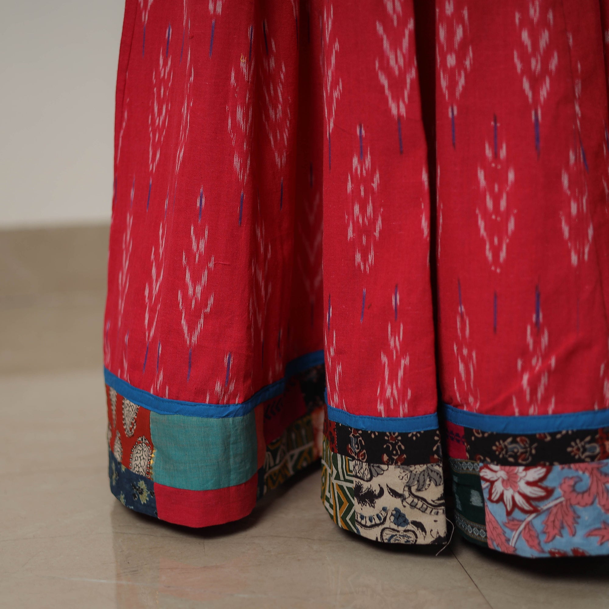 Elevate your wardrobe with this handcrafted 24 kali pink cotton pochampally ikat skirt with Patchwork border. Celebrating the rich heritage of Pochampally weaving this skirt combines traditional craftsmanship with modern elegance. The intricate Ikat patterns are meticulously created using hand-dyeing techniques reflecting the artisanal skill passed down through generations. Made from breathable eco-friendly cotton it offers a perfect fit with its adjustable tie-up waist closure. The patchwork border adds a unique touch making this skirt a versatile piece for festive occasions or casual outings.