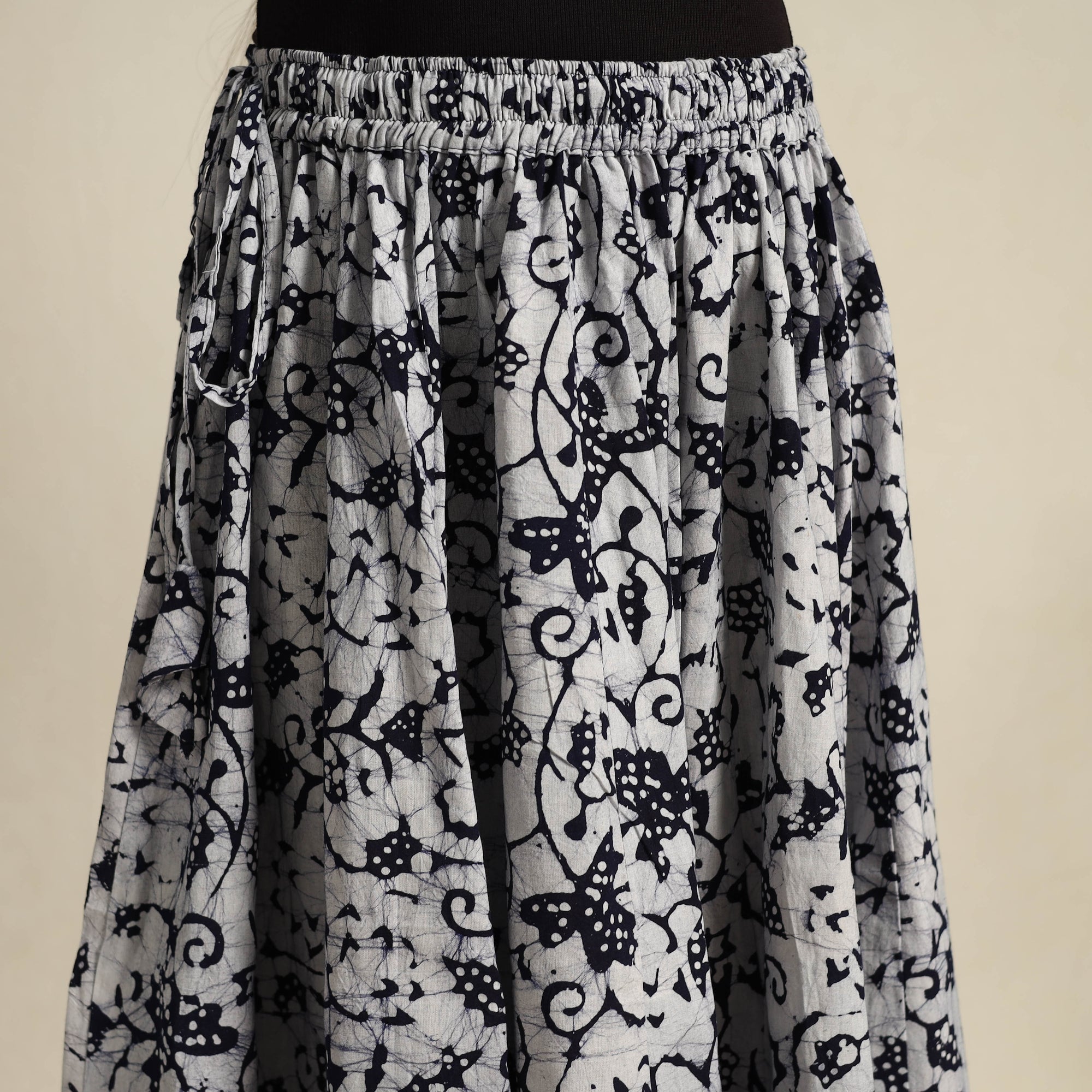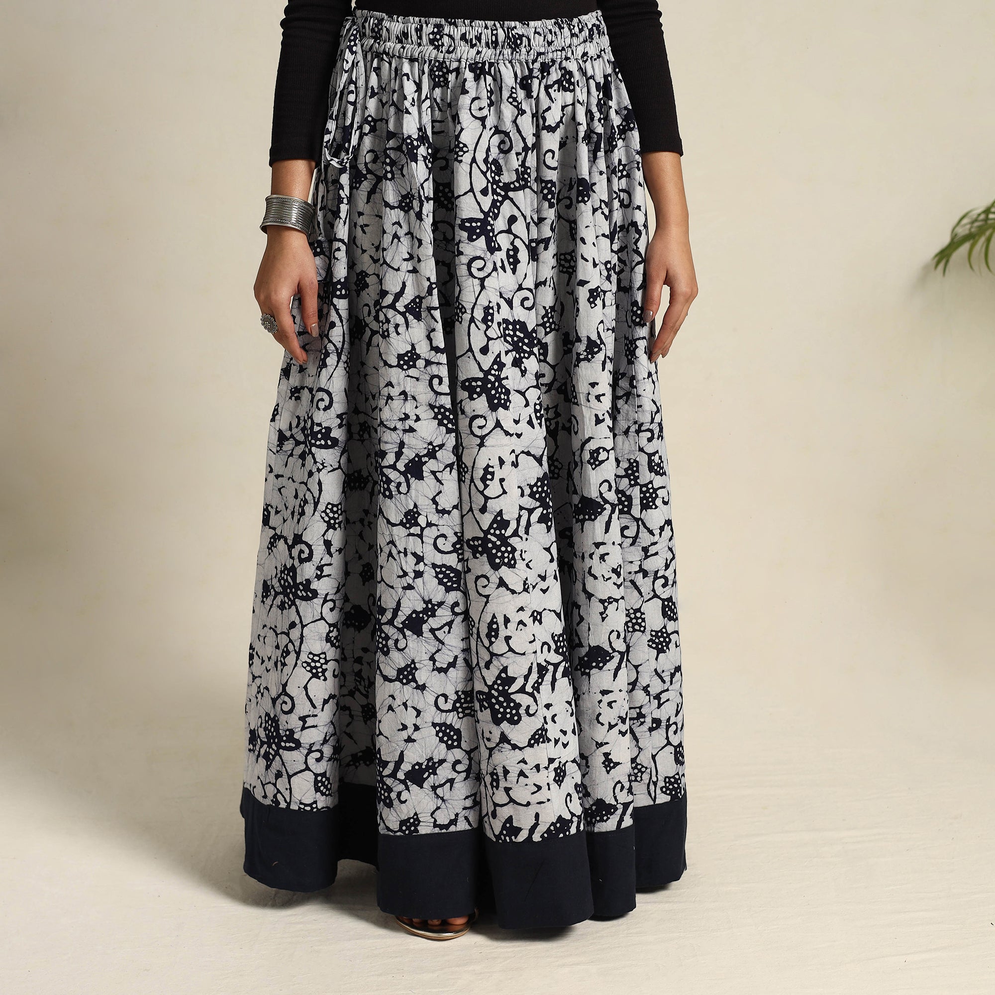 Add a touch of Indian tradition to your wardrobe with our 24 kali black patchwork batik print cotton long skirt. Crafted using the intricate Batik dyeing technique, this 24 Kali patchwork design blends culture and style beautifully. The skirt features a waist tie-up closure for a customizable fit and comes with a plain border, adding a simple yet elegant touch. Perfect for festive celebrations or casual outings.