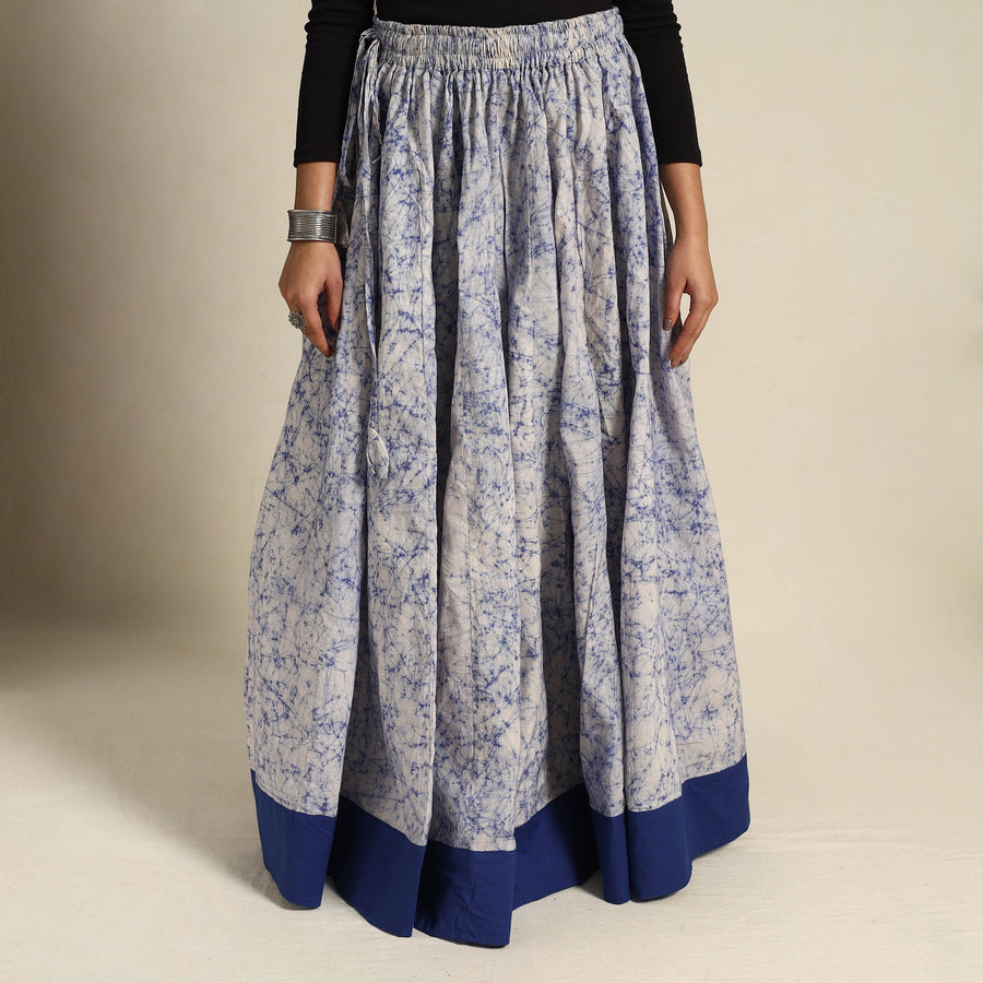 Add a touch of Indian tradition to your wardrobe with our blue 24 kali patchwork batik print cotton long skirt. Crafted using the intricate Batik dyeing technique, this 24 Kali patchwork design blends culture and style beautifully. The skirt features a waist tie-up closure for a customizable fit and comes with a plain border, adding a simple yet elegant touch. Perfect for festive celebrations or casual outings.