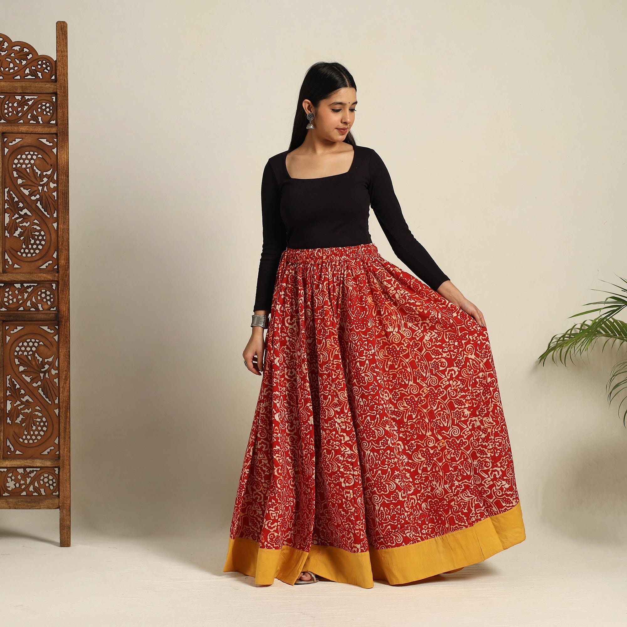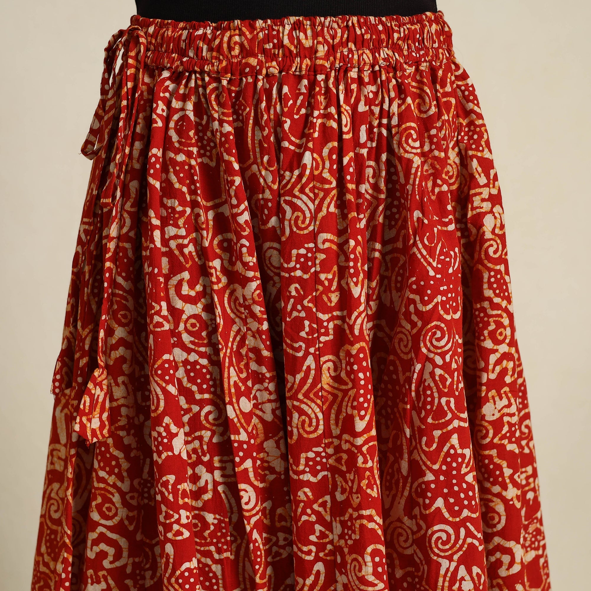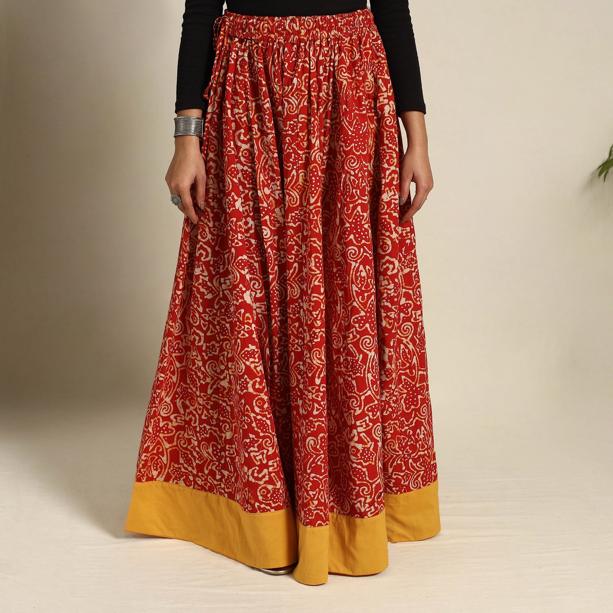 Add a touch of Indian tradition to your wardrobe with our 24 kali red patchwork batik print cotton long skirt. Crafted using the intricate Batik dyeing technique, this 24 Kali patchwork design blends culture and style beautifully. The skirt features a waist tie-up closure for a customizable fit and comes with a plain border, adding a simple yet elegant touch. Perfect for festive celebrations or casual outings.