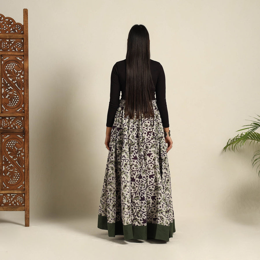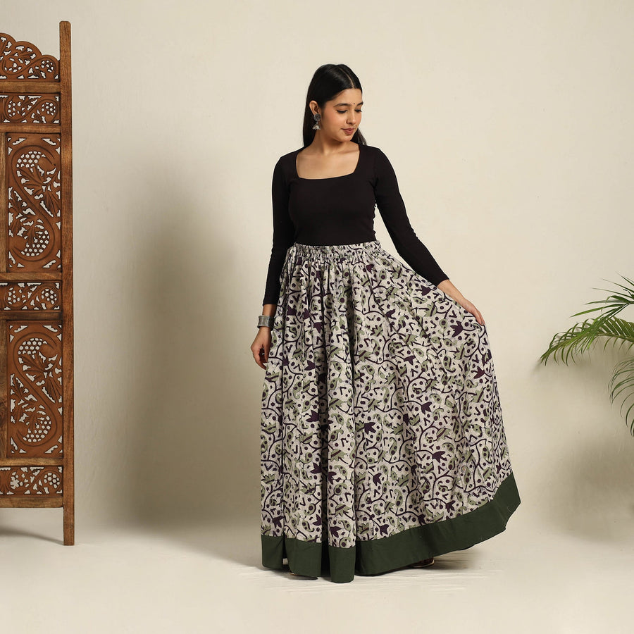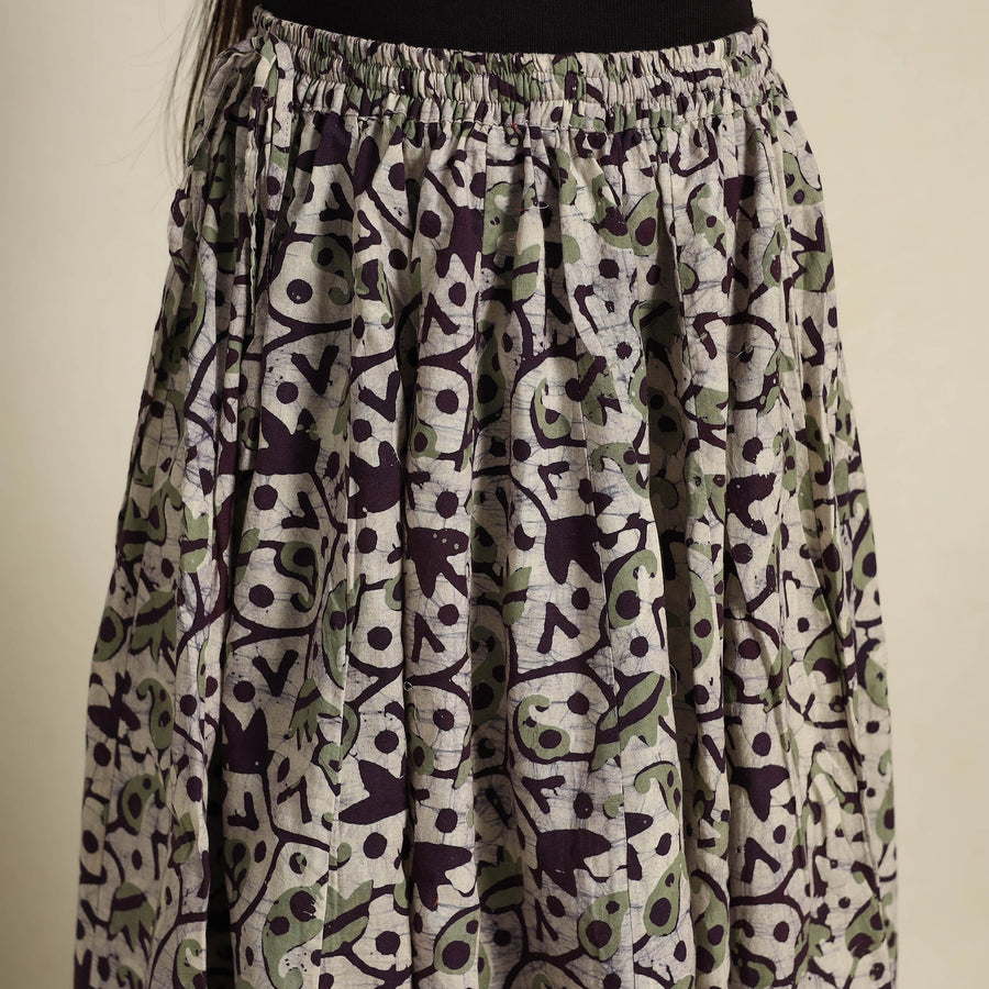 Add a touch of Indian tradition to your wardrobe with our 24 kali beige patchwork batik print cotton long skirt. Crafted using the intricate Batik dyeing technique, this 24 Kali patchwork design blends culture and style beautifully. The skirt features a waist tie-up closure for a customizable fit and comes with a plain border, adding a simple yet elegant touch. Perfect for festive celebrations or casual outings.