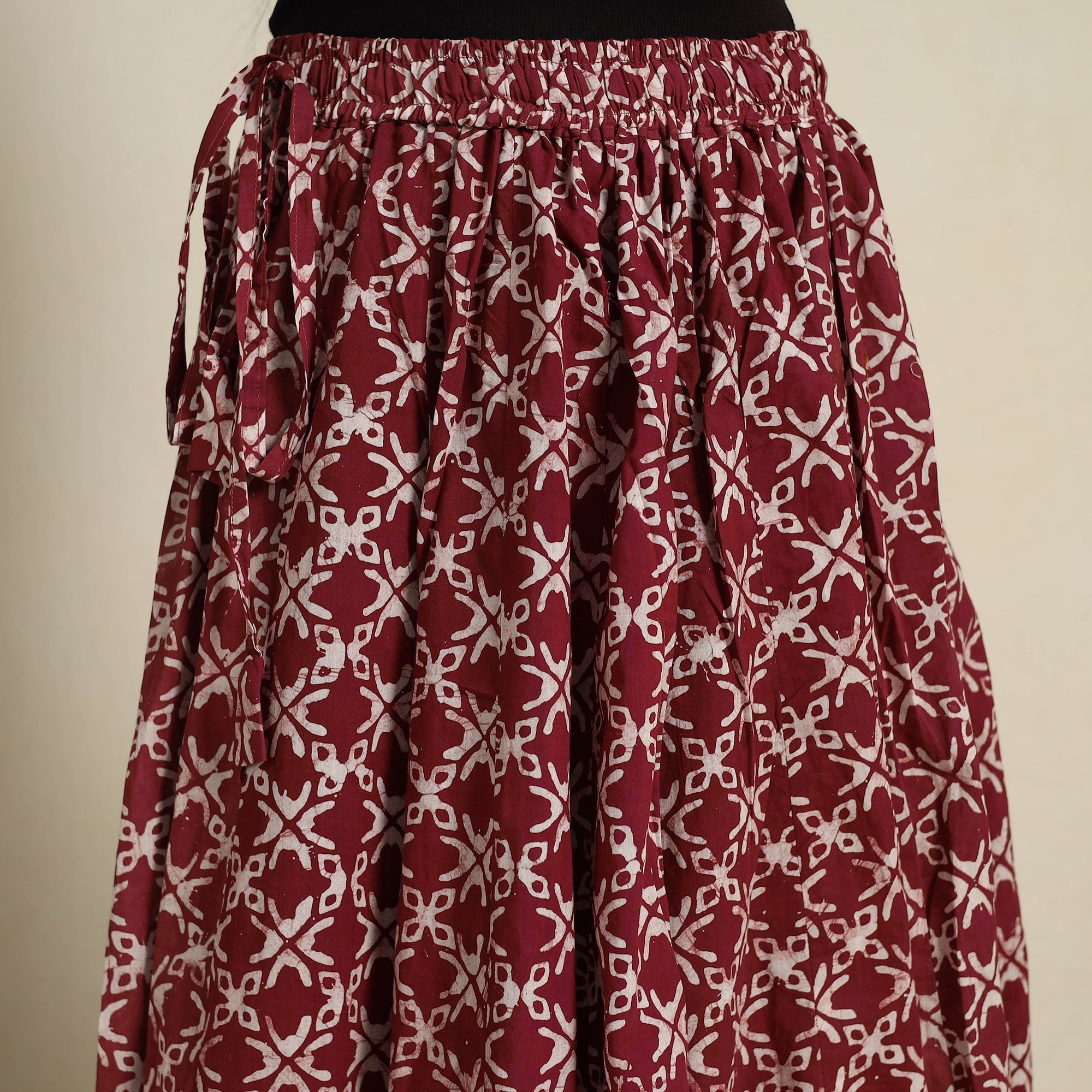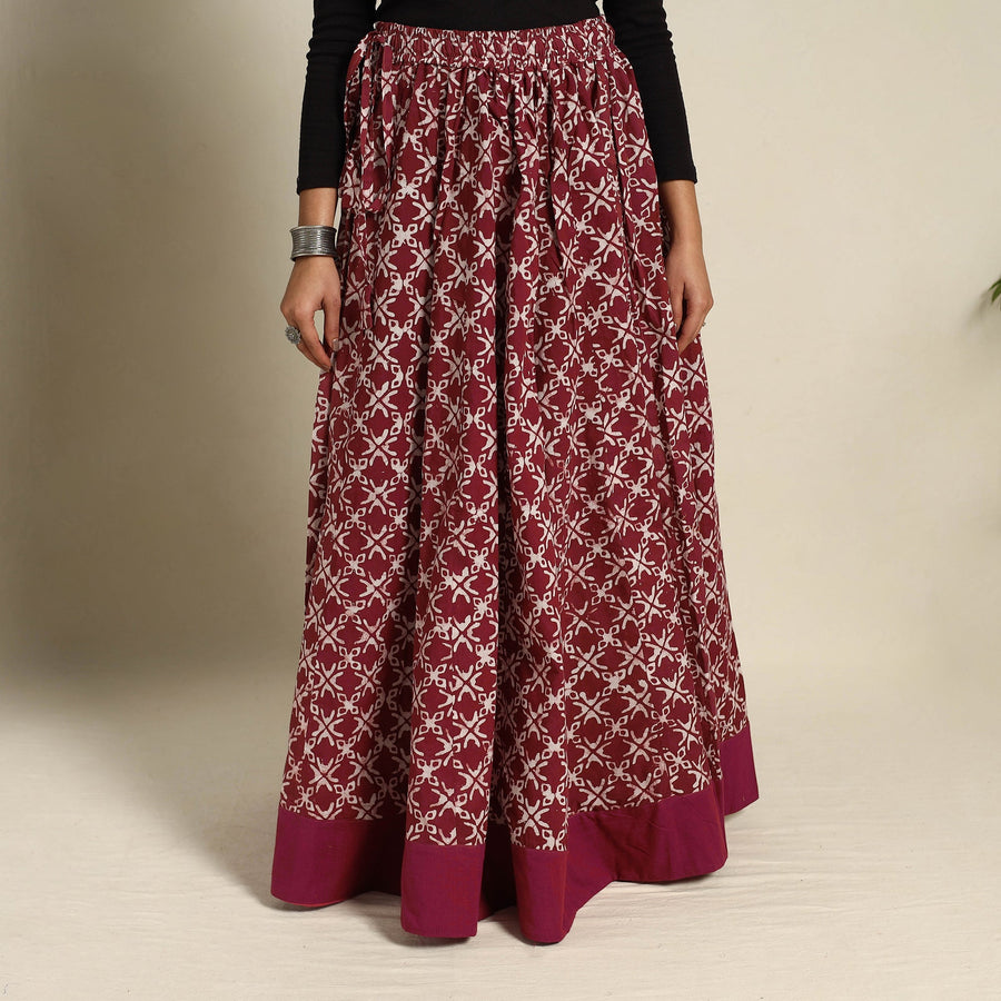Add a touch of Indian tradition to your wardrobe with our 24 kali maroon patchwork batik print cotton long skirt. Crafted using the intricate Batik dyeing technique, this 24 Kali patchwork design blends culture and style beautifully. The skirt features a waist tie-up closure for a customizable fit and comes with a plain border, adding a simple yet elegant touch. Perfect for festive celebrations or casual outings.