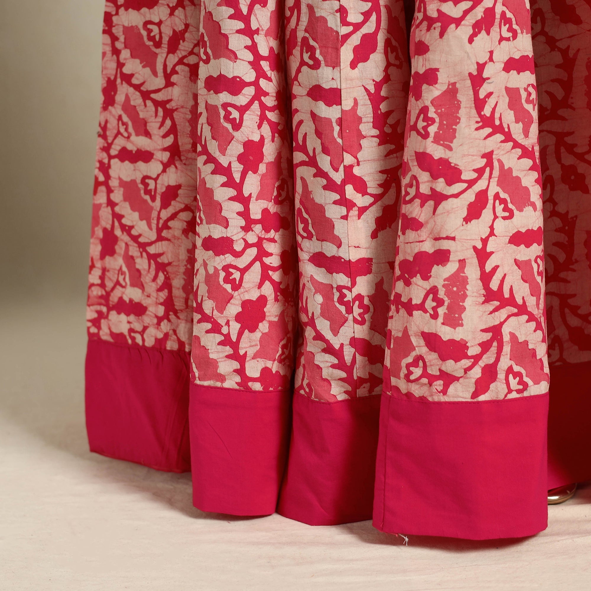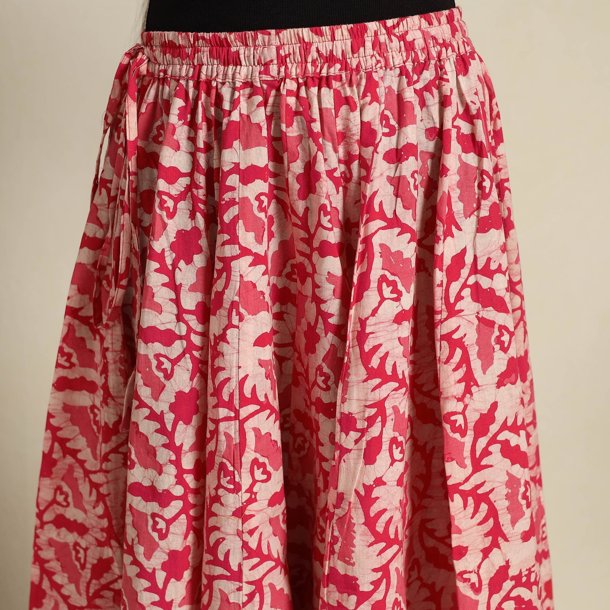 Add a touch of Indian tradition to your wardrobe with our 24 kali pink patchwork batik print cotton long skirt. Crafted using the intricate Batik dyeing technique, this 24 Kali patchwork design blends culture and style beautifully. The skirt features a waist tie-up closure for a customizable fit and comes with a plain border, adding a simple yet elegant touch. Perfect for festive celebrations or casual outings.