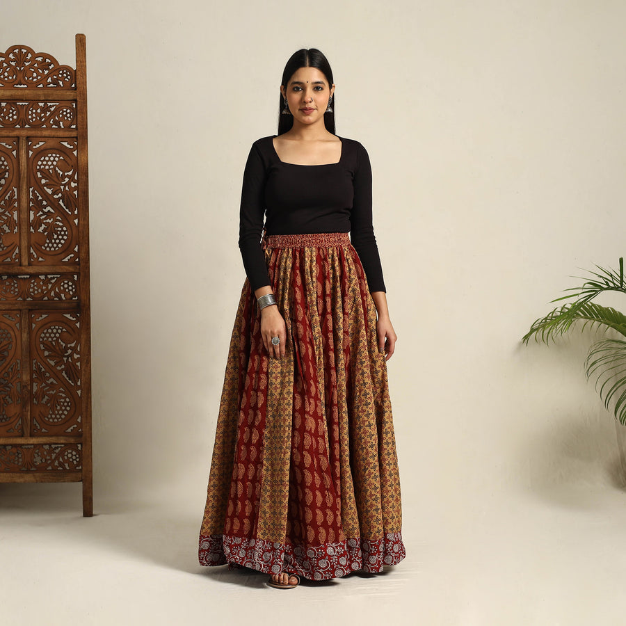 Experience the charm of heritage with this multicolor 24 kali patchwork cotton bagh print skirt. Designed using the Bagh block printing technique, this skirt showcases intricate floral and geometric patterns, hand-printed with eco-friendly natural dyes. Featuring a waist tie-up closure for a customizable fit, this long skirt is a perfect choice for festive celebrations or casual outings.