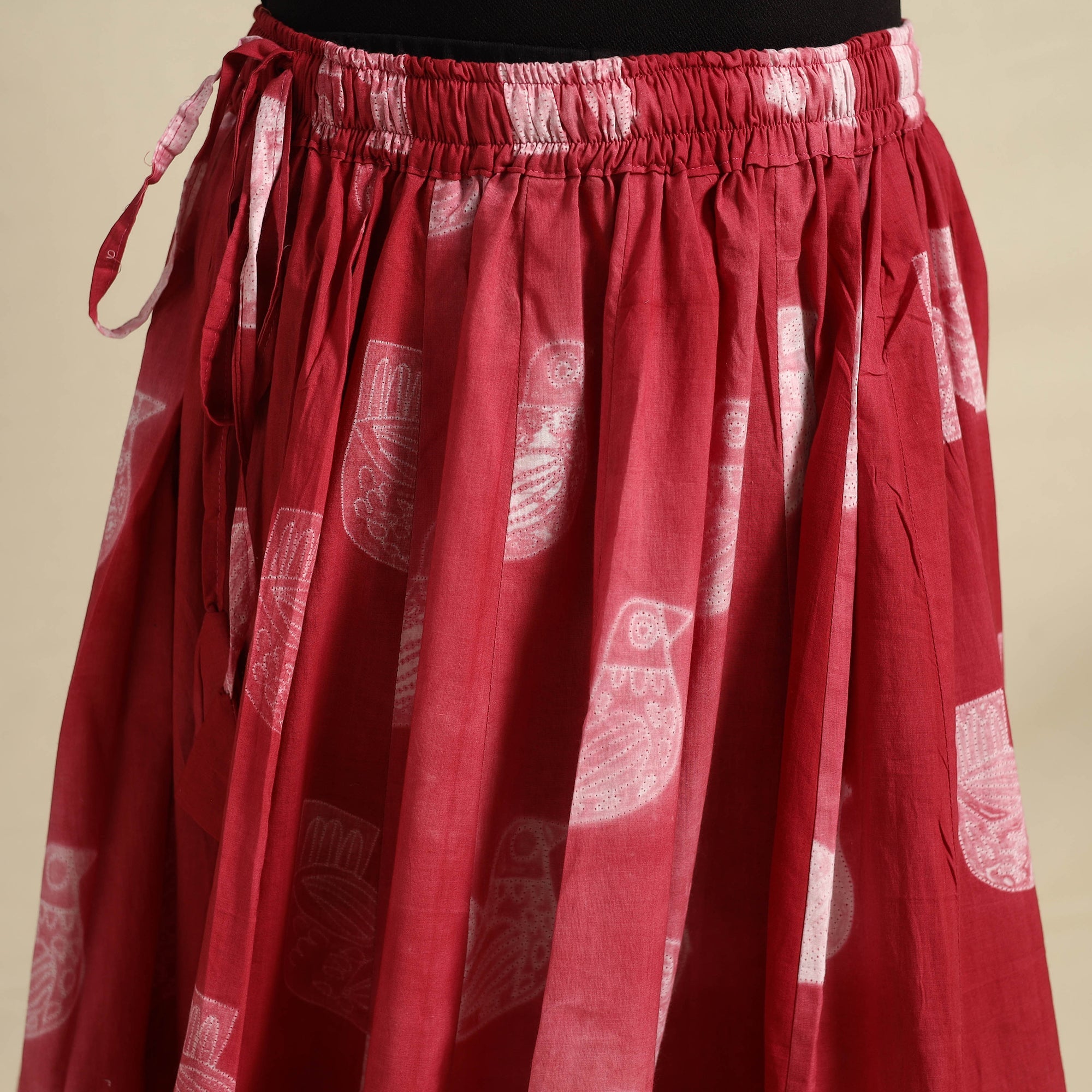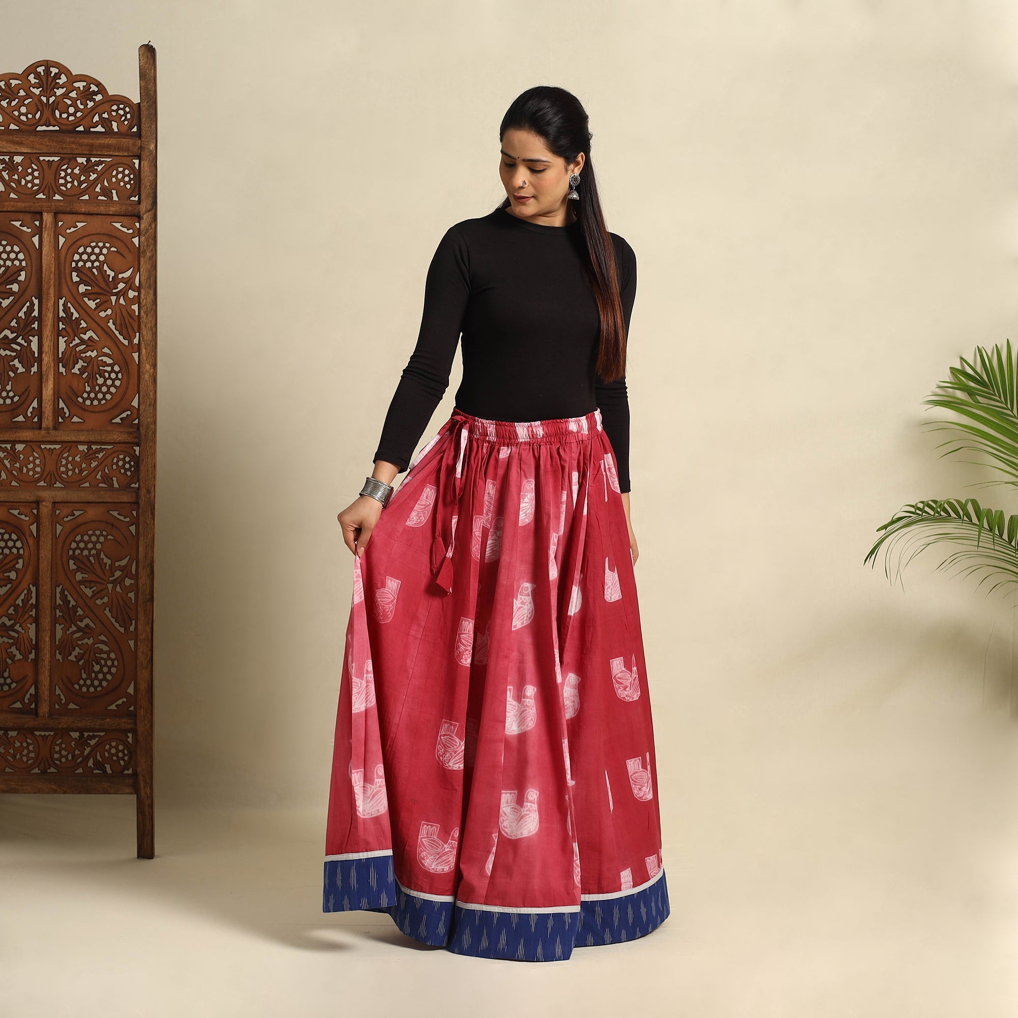 Elevate your style with this exquisite 24 kali red patchwork cotton long skirt, beautifully adorned with traditional Shibori tie-dye. Designed with a flowing, graceful silhouette, this skirt showcases intricate patchwork detailing, making each piece unique. Crafted from soft, breathable cotton, the Shibori technique lends mesmerizing, one-of-a-kind patterns to the fabric. The adjustable waist tie-up closure ensures a comfortable and customizable fit, making it a perfect choice for festivals, casual outings, or a chic bohemian look.