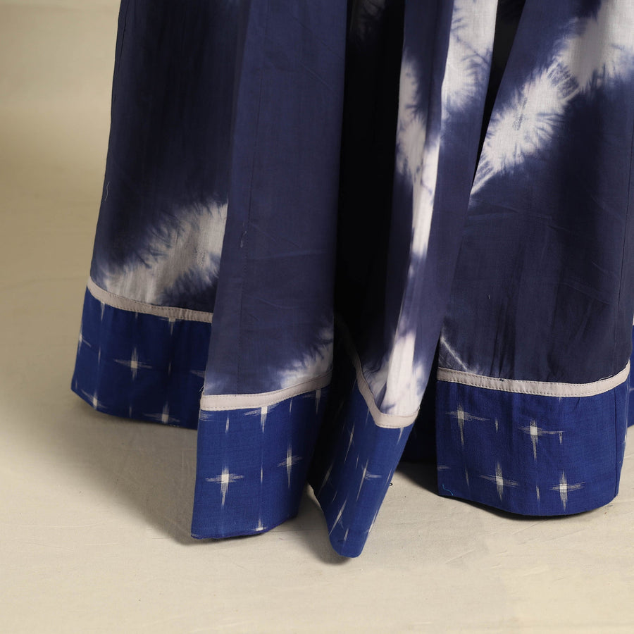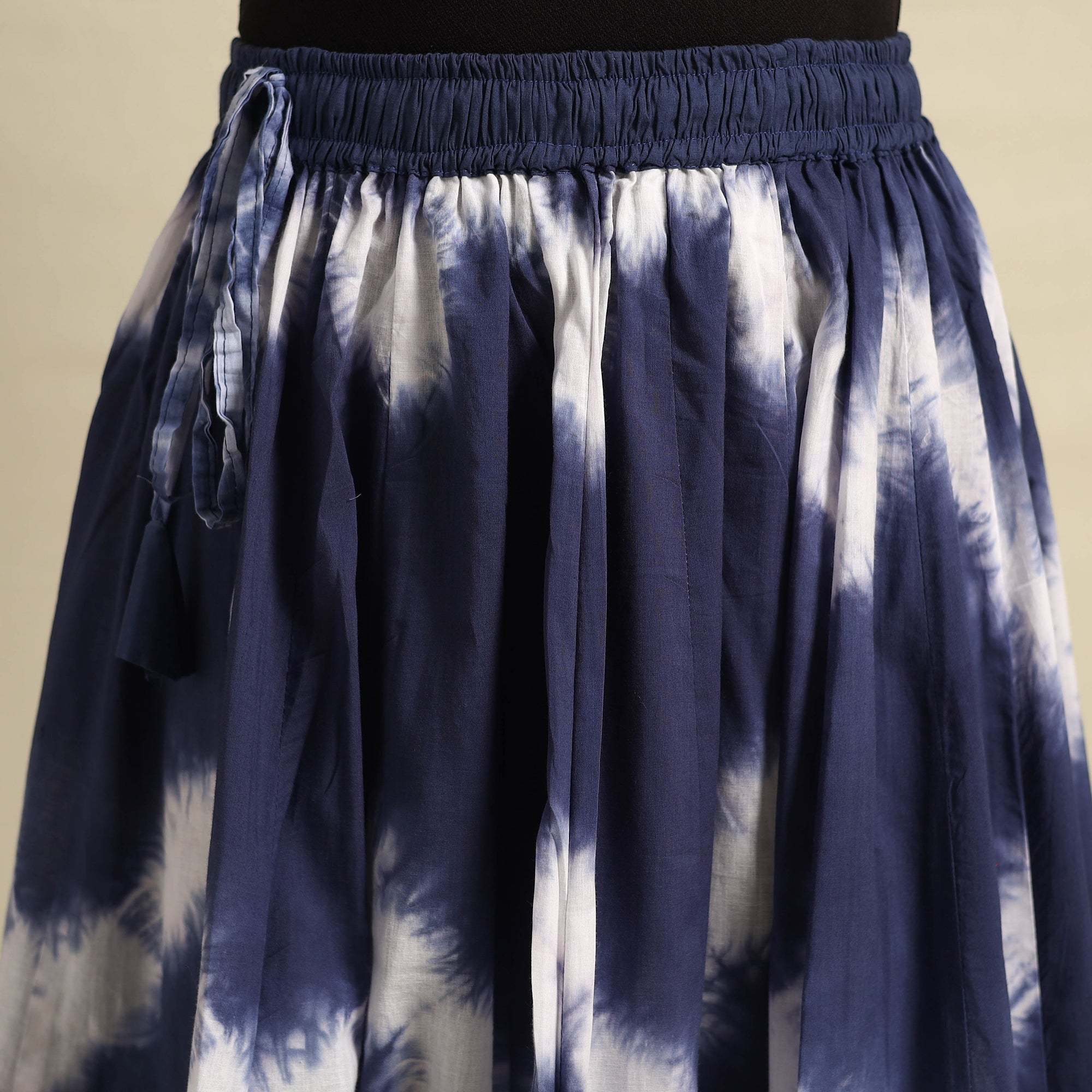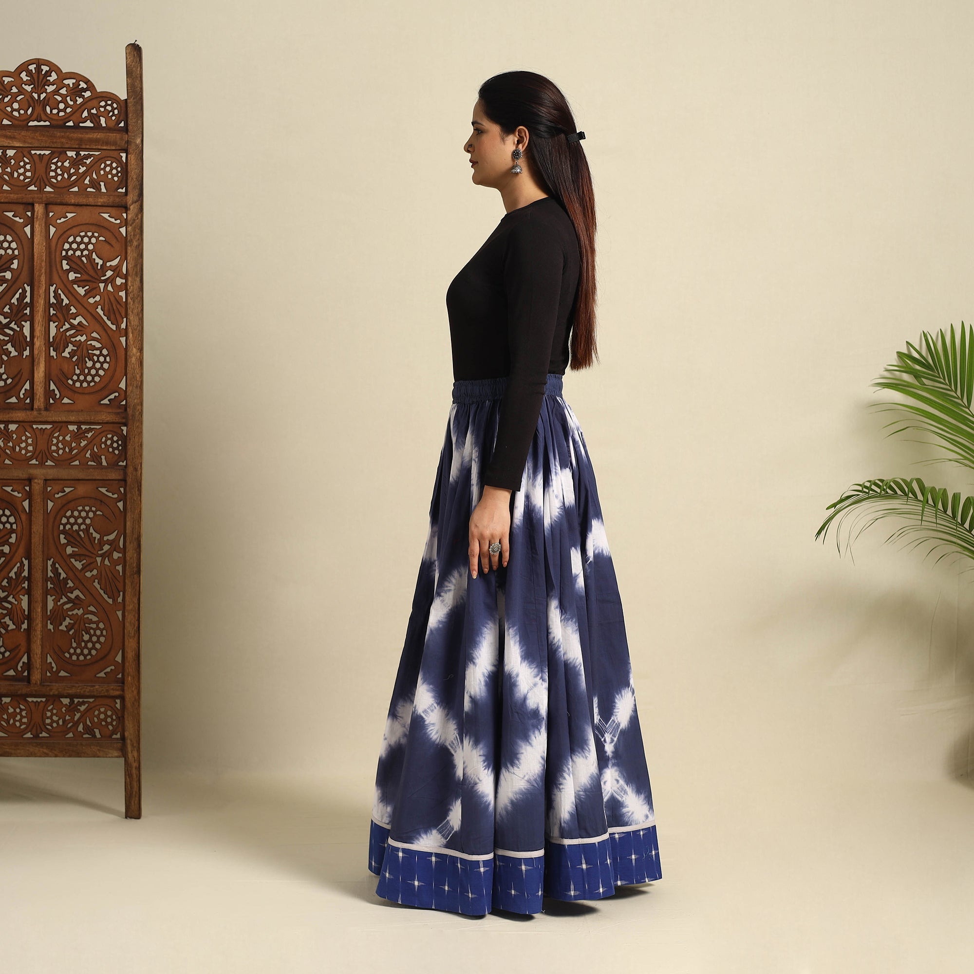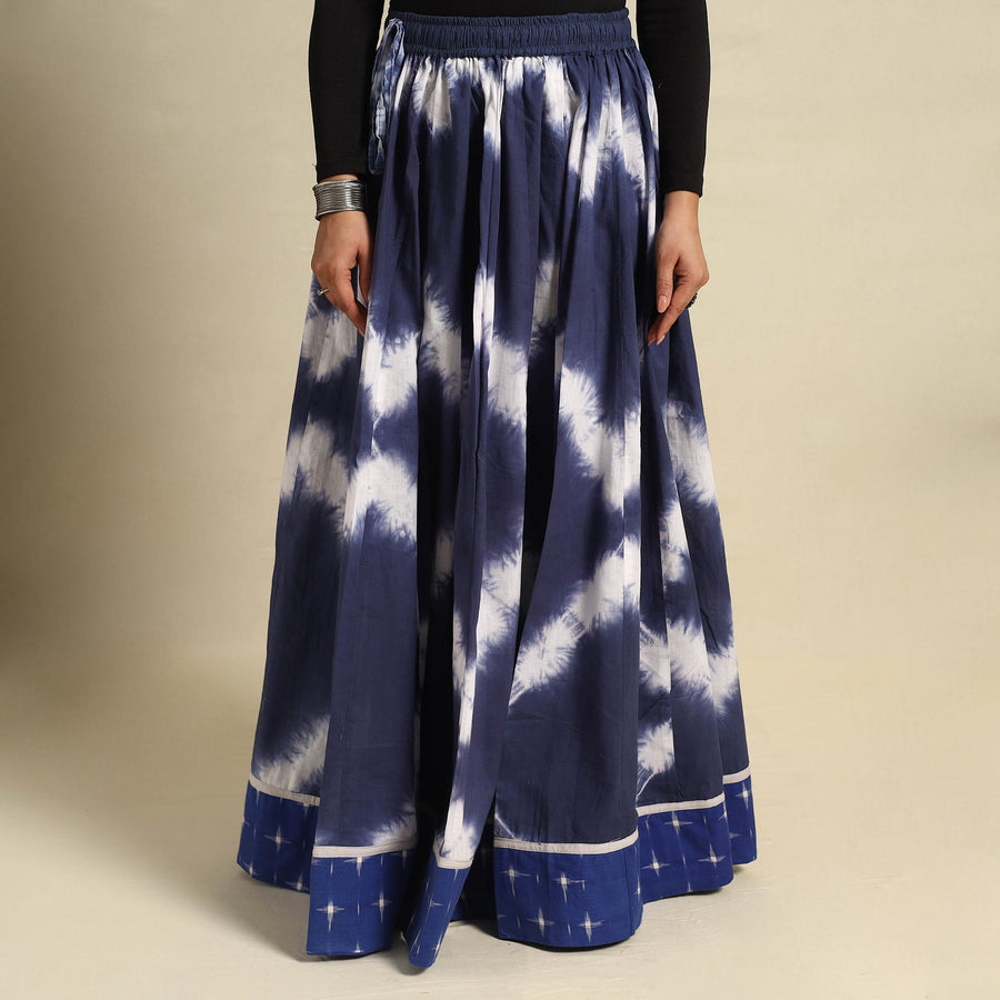 Elevate your style with this exquisite 24 Kali blue patchwork cotton long skirt, beautifully adorned with traditional Shibori tie-dye. Designed with a flowing, graceful silhouette, this skirt showcases intricate patchwork detailing, making each piece unique. Crafted from soft, breathable cotton, the Shibori technique lends mesmerizing, one-of-a-kind patterns to the fabric. The adjustable waist tie-up closure ensures a comfortable and customizable fit, making it a perfect choice for festivals, casual outings, or a chic bohemian look.