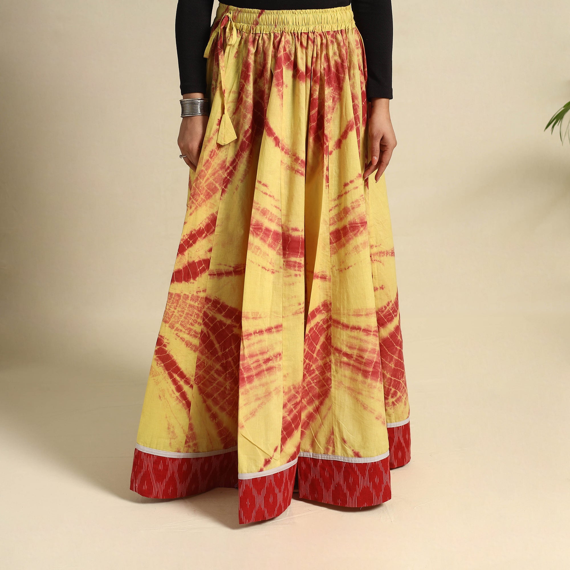 Elevate your style with this exquisite 24 Kali yellow patchwork cotton long skirt, beautifully adorned with traditional Shibori tie-dye. Designed with a flowing, graceful silhouette, this skirt showcases intricate patchwork detailing, making each piece unique. Crafted from soft, breathable cotton, the Shibori technique lends mesmerizing, one-of-a-kind patterns to the fabric. The adjustable waist tie-up closure ensures a comfortable and customizable fit, making it a perfect choice for festivals, casual outings, or a chic bohemian look.