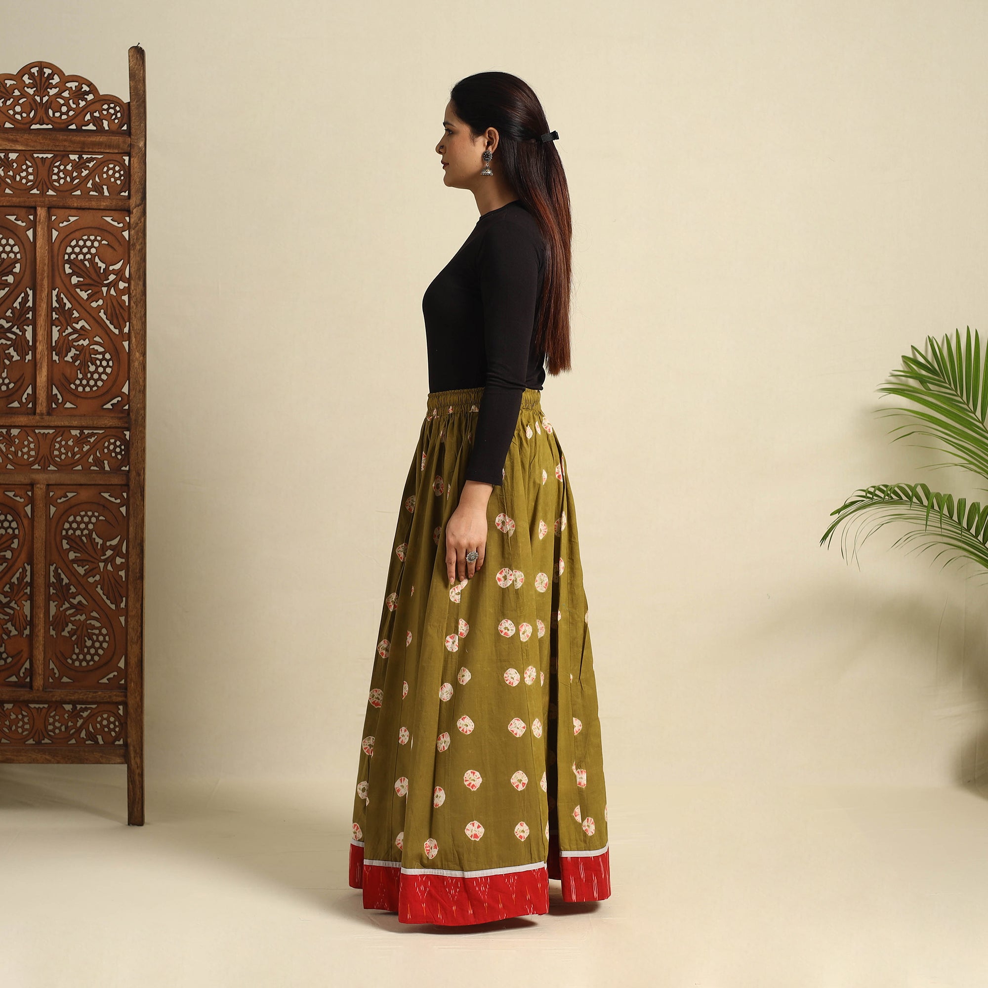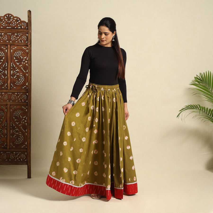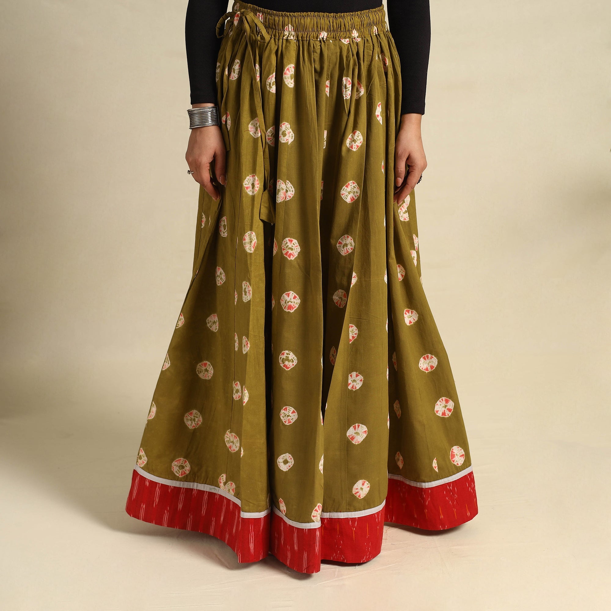 | Material | Elevate your style with this exquisite 24 Kali green patchwork cotton long skirt, beautifully adorned with traditional Shibori tie-dye. Designed with a flowing, graceful silhouette, this skirt showcases intricate patchwork detailing, making each piece unique. Crafted from soft, breathable cotton, the Shibori technique lends mesmerizing, one-of-a-kind patterns to the fabric. The adjustable waist tie-up closure ensures a comfortable and customizable fit, making it a perfect choice for festivals, casual outings, or a chic bohemian look. |
