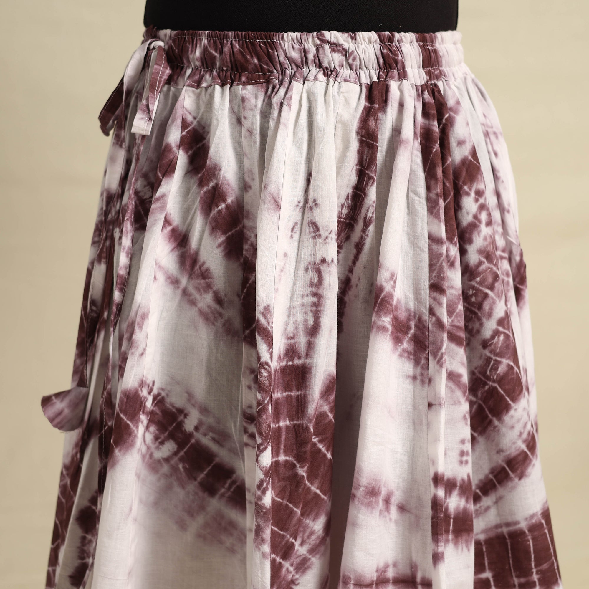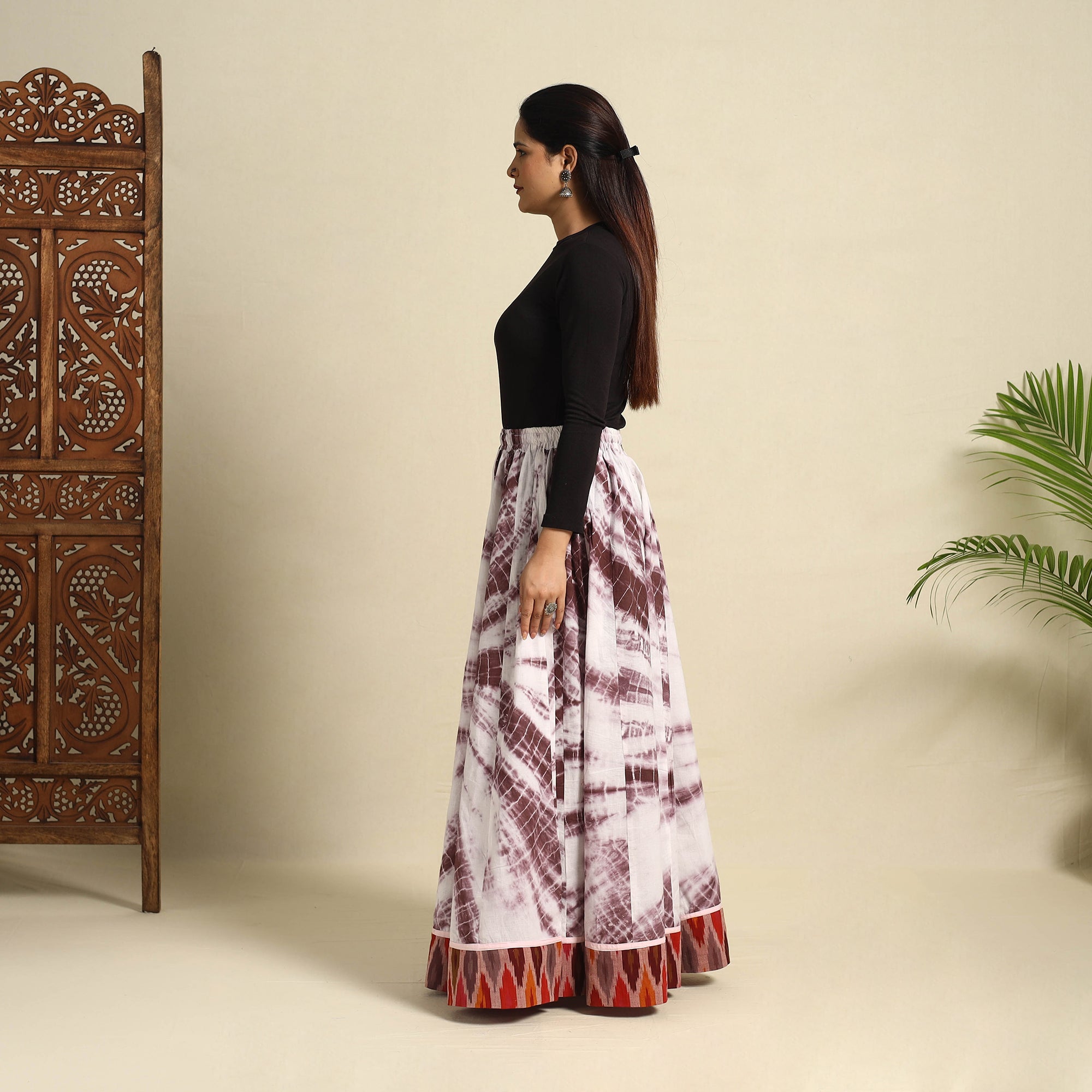 Elevate your style with this exquisite 24 kali brown patchwork cotton long skirt, beautifully adorned with traditional Shibori tie-dye. Designed with a flowing, graceful silhouette, this skirt showcases intricate patchwork detailing, making each piece unique. Crafted from soft, breathable cotton, the Shibori technique lends mesmerizing, one-of-a-kind patterns to the fabric. The adjustable waist tie-up closure ensures a comfortable and customizable fit, making it a perfect choice for festivals, casual outings, or a chic bohemian look.