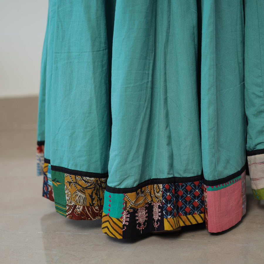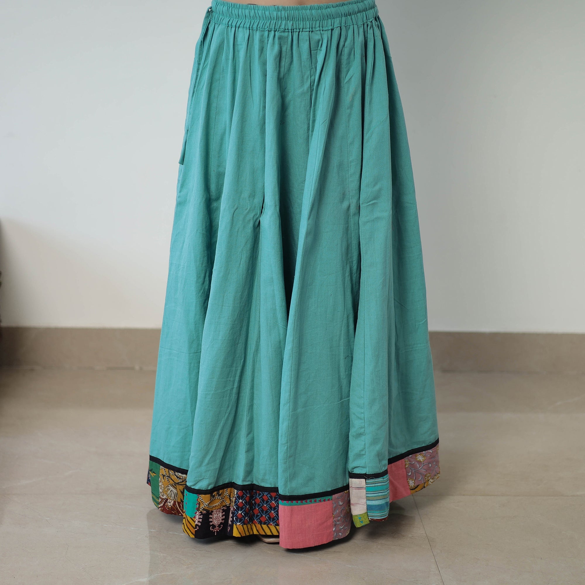 Plain cotton skirt meticulously handcrafted by skilled artisans. Featuring a beautiful 24 Kali design and a patchwork border, this skirt combines simplicity with elegance. The adjustable waist tie-up ensures a comfortable and customizable fit, making it perfect for casual outings or cultural festivities.