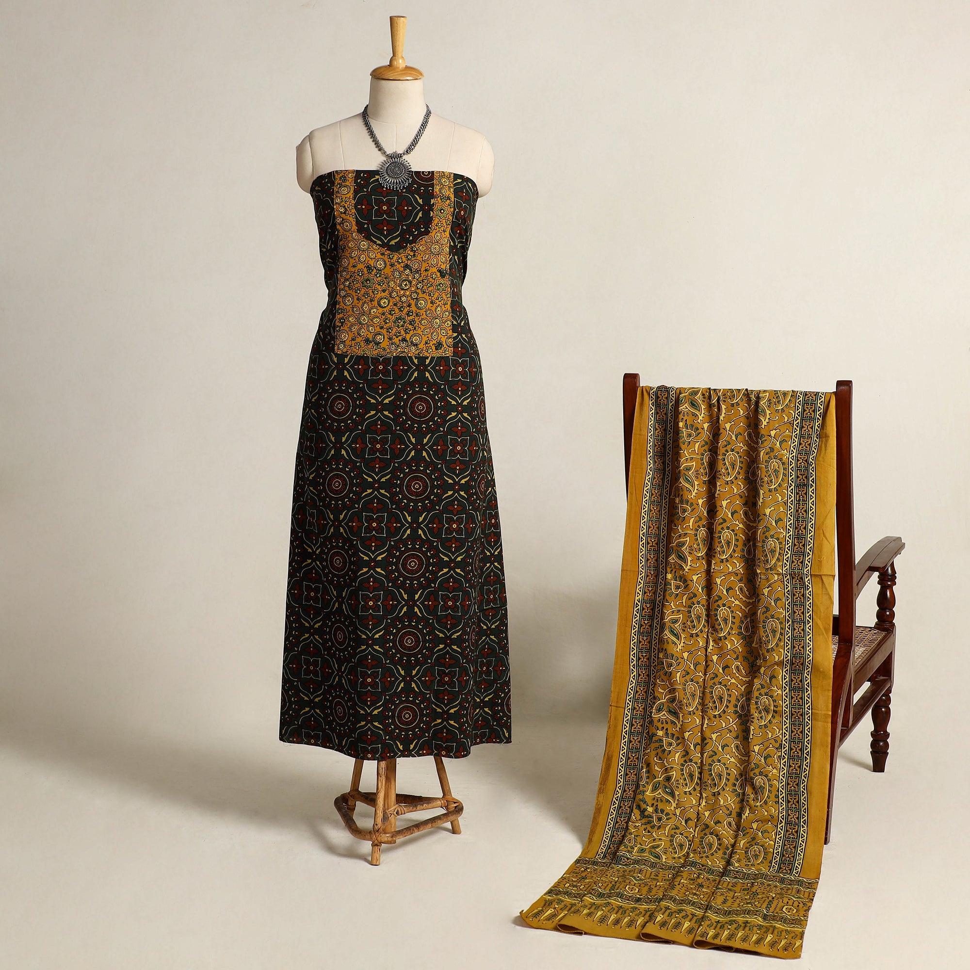 This green 2pc ajrakh block print dress material set is crafted from soft cotton and printed using natural dyes. It features traditional Ajrakh motifs along with a coordinated patch. Paired with a cotton dupatta, it brings a classic, handcrafted feel to your wardrobe ideal for festive occasions or relaxed everyday wear.