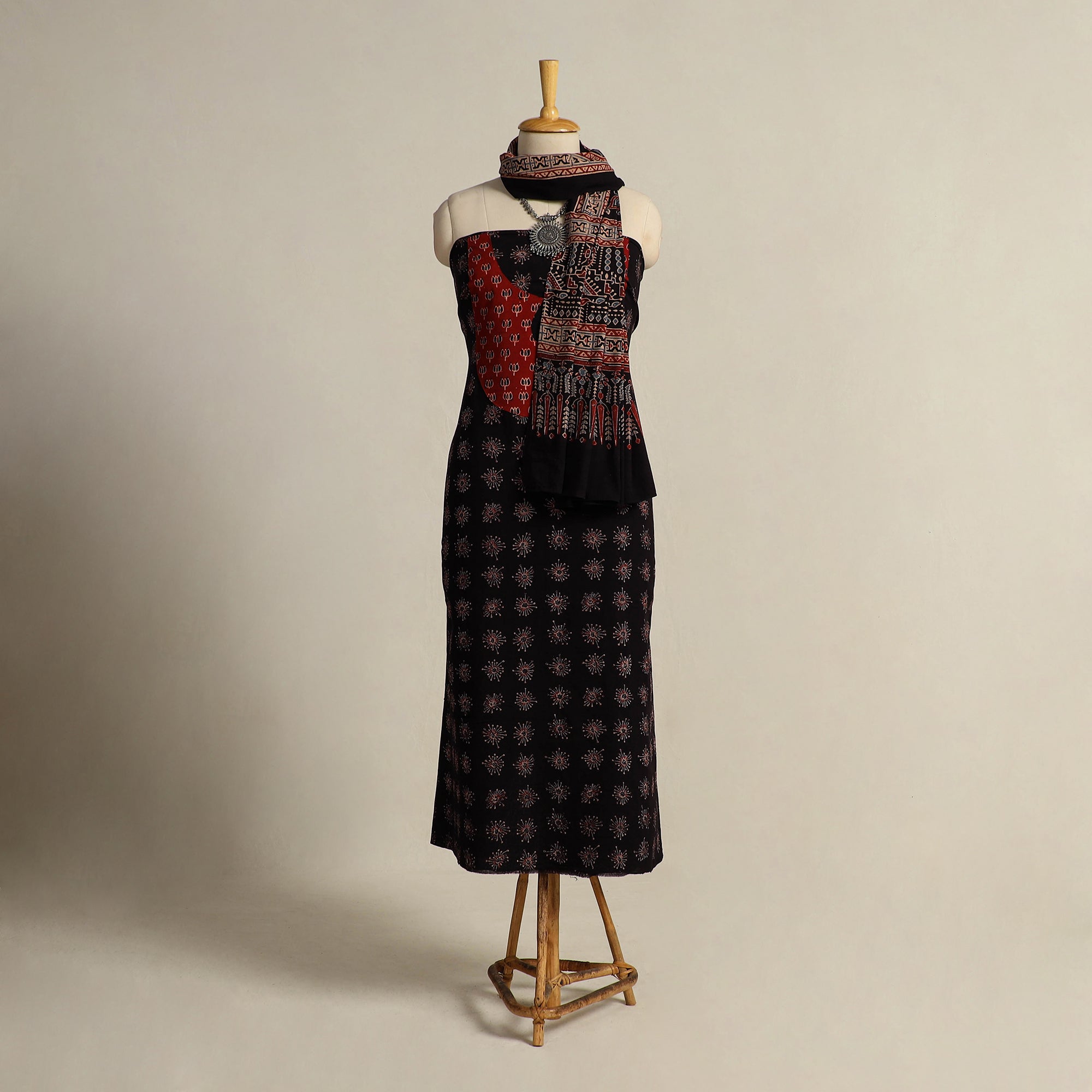This black 2pc ajrakh block print dress material set is crafted from soft cotton and printed using natural dyes. It features traditional Ajrakh motifs along with a coordinated patch. Paired with a cotton dupatta, it brings a classic, handcrafted feel to your wardrobe ideal for festive occasions or relaxed everyday wear.