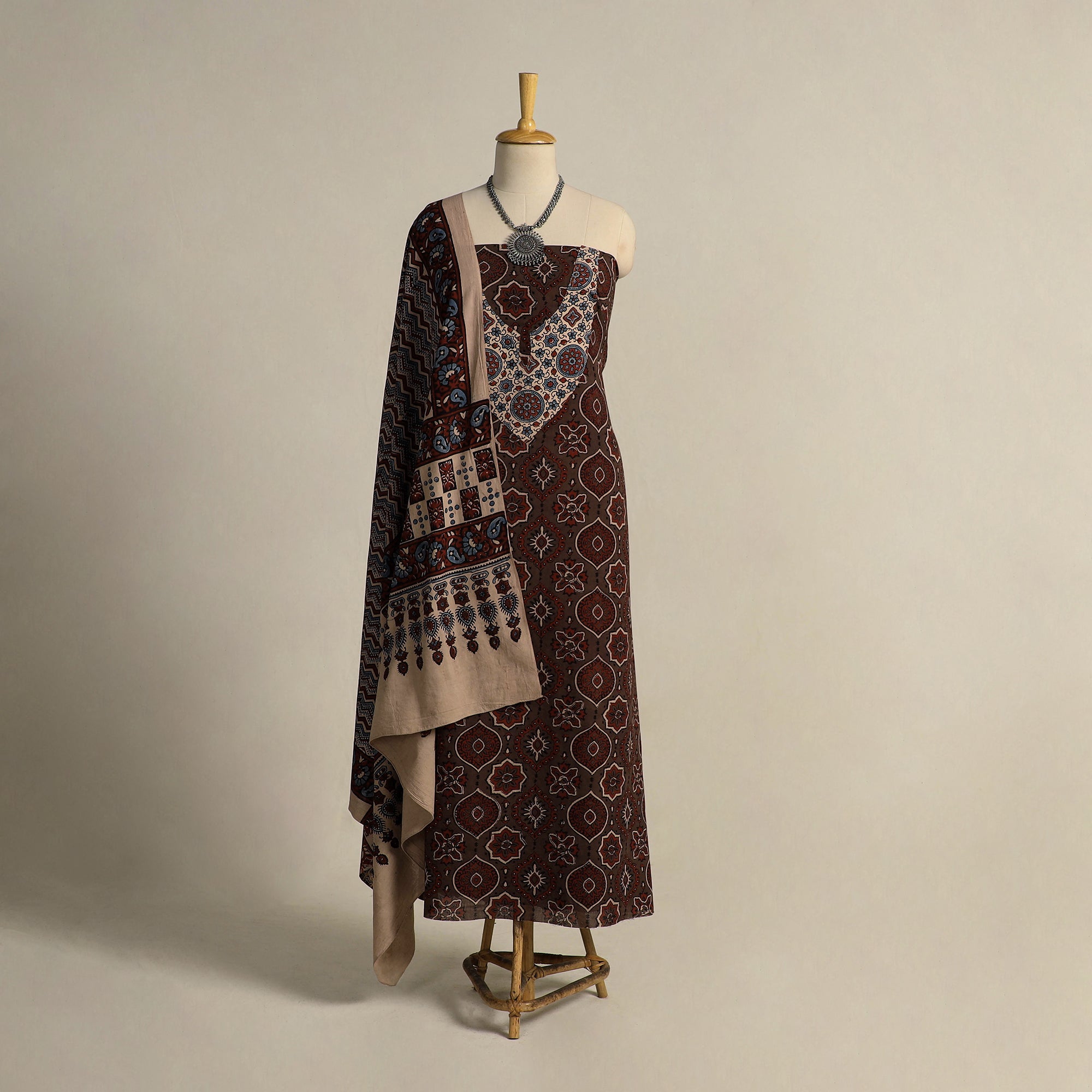 This brown 2pc ajrakh block print dress material set is crafted from soft cotton and printed using natural dyes. It features traditional Ajrakh motifs along with a coordinated patch. Paired with a cotton dupatta, it brings a classic, handcrafted feel to your wardrobe ideal for festive occasions or relaxed everyday wear.