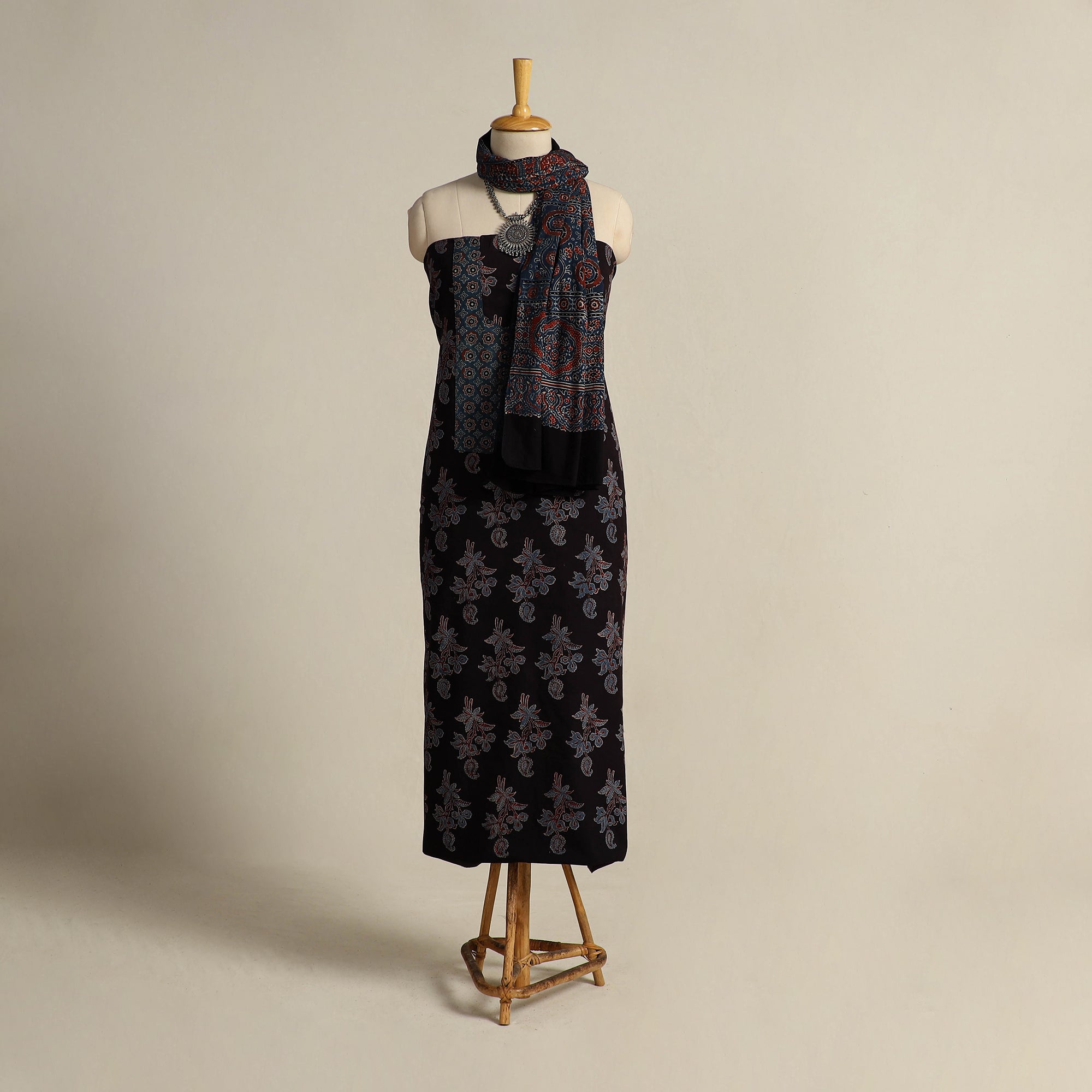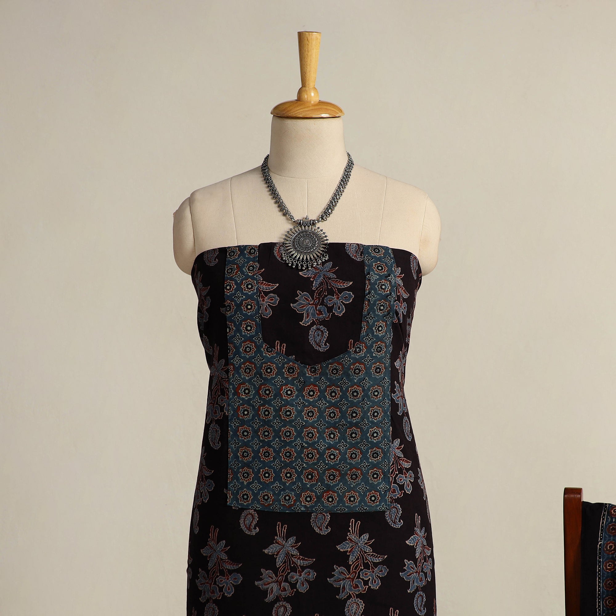 This black 2pc ajrakh block print dress material set is crafted from soft cotton and printed using natural dyes. It features traditional Ajrakh motifs along with a coordinated patch. Paired with a cotton dupatta, it brings a classic, handcrafted feel to your wardrobe ideal for festive occasions or relaxed everyday wear.