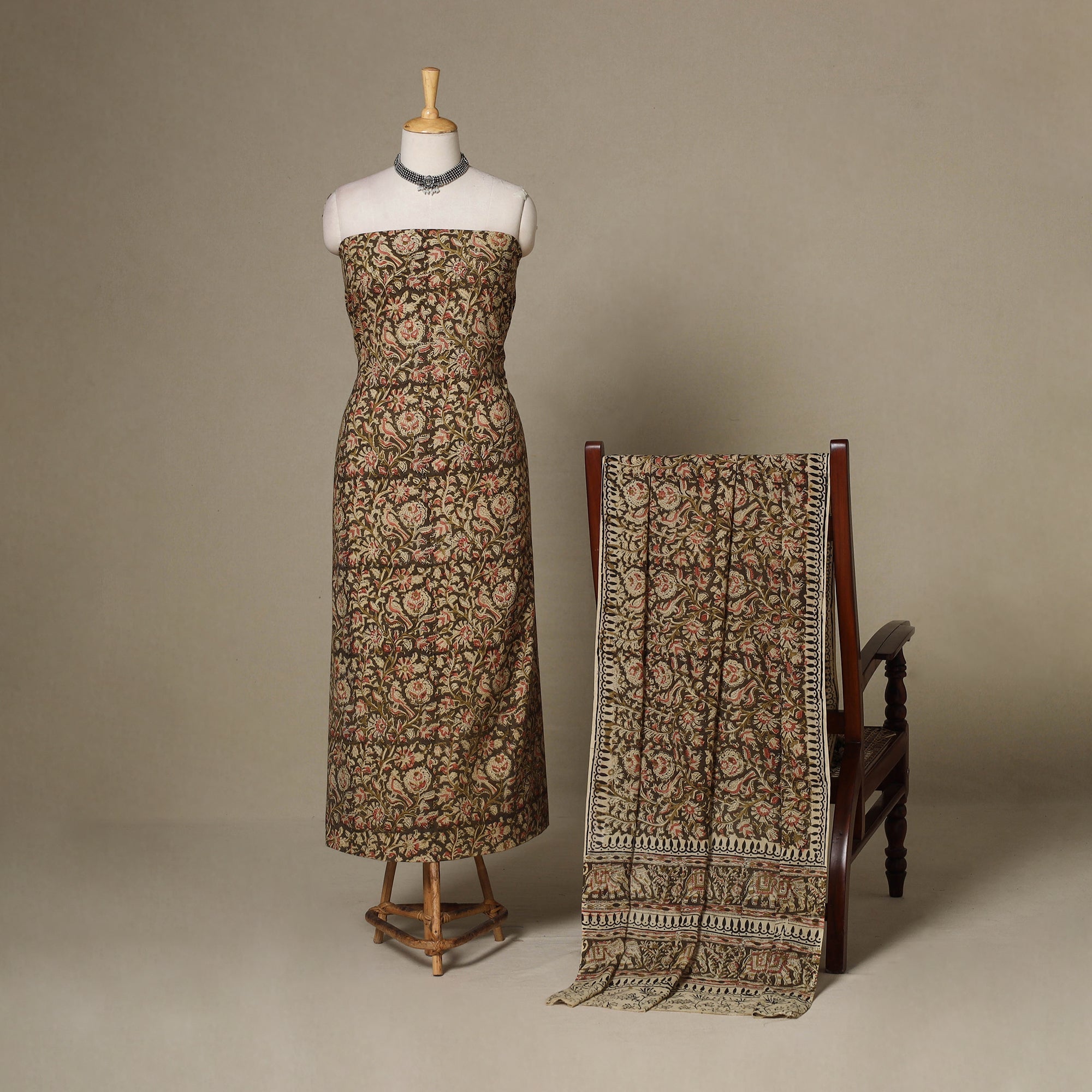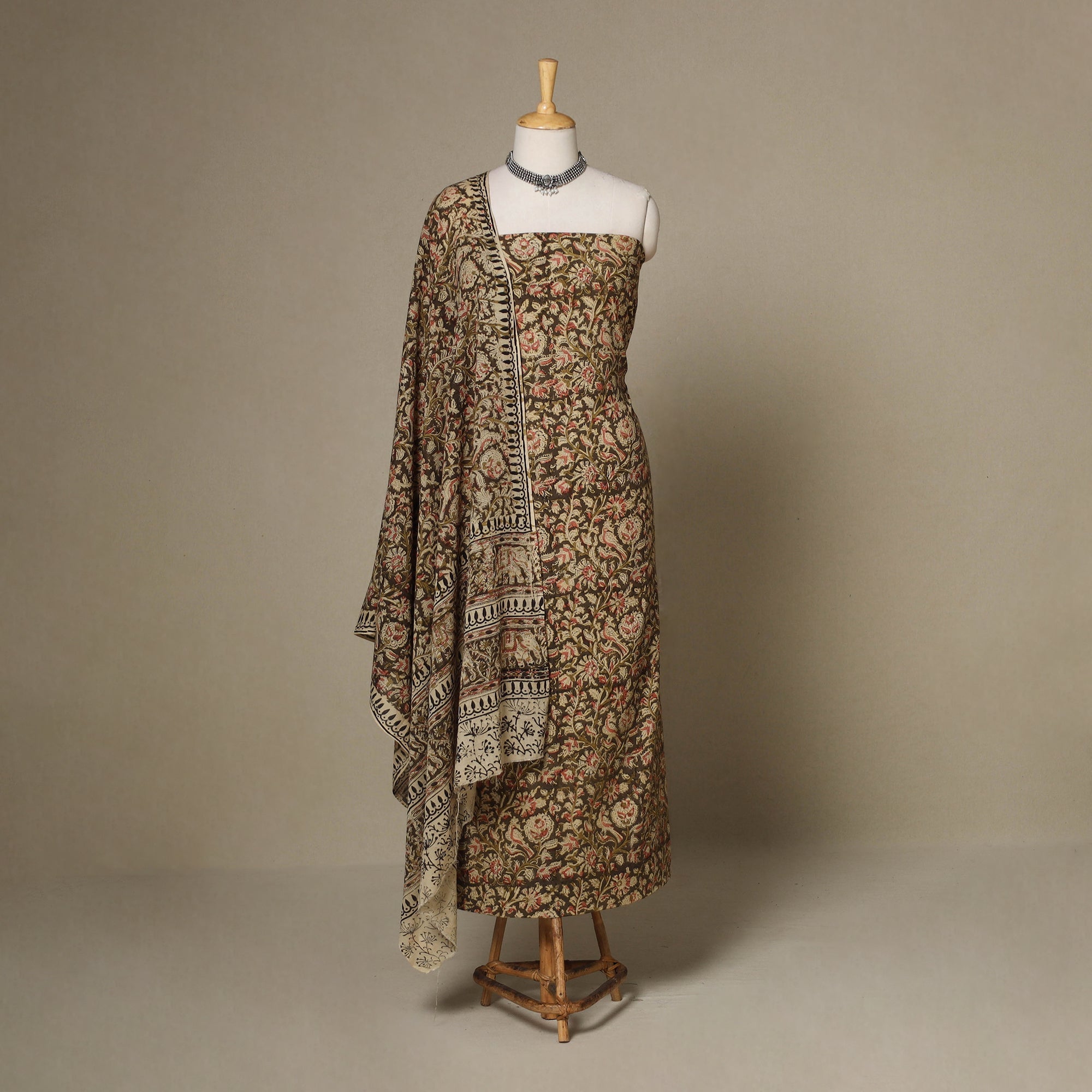 Discover the charm of brown kalamkari hand block printing in this 2pc cotton dress material set. Made with natural dyes and carved wooden blocks, it captures the grace of traditional Indian textile artistry. This set features a delicately printed kurta fabric with a coordinated dupatta, combining breathable comfort with heritage-rich elegance.