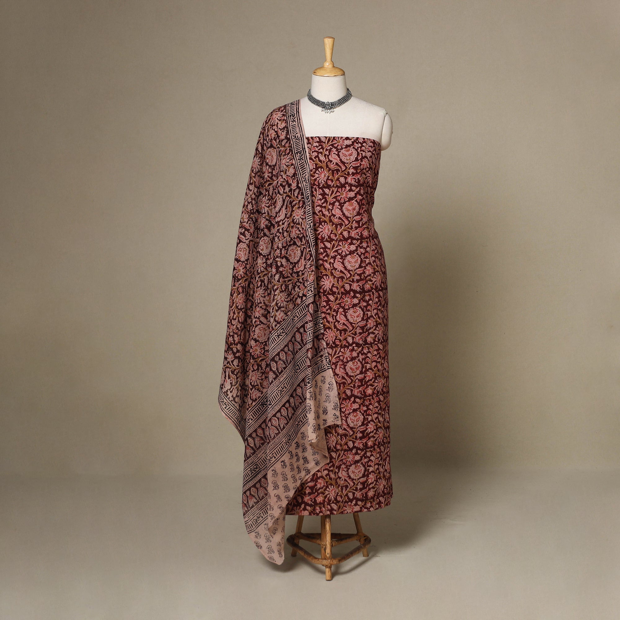 Discover the charm of maroon kalamkari hand block printing in this 2pc cotton dress material set. Made with natural dyes and carved wooden blocks, it captures the grace of traditional Indian textile artistry. This set features a delicately printed kurta fabric with a coordinated dupatta, combining breathable comfort with heritage-rich elegance.