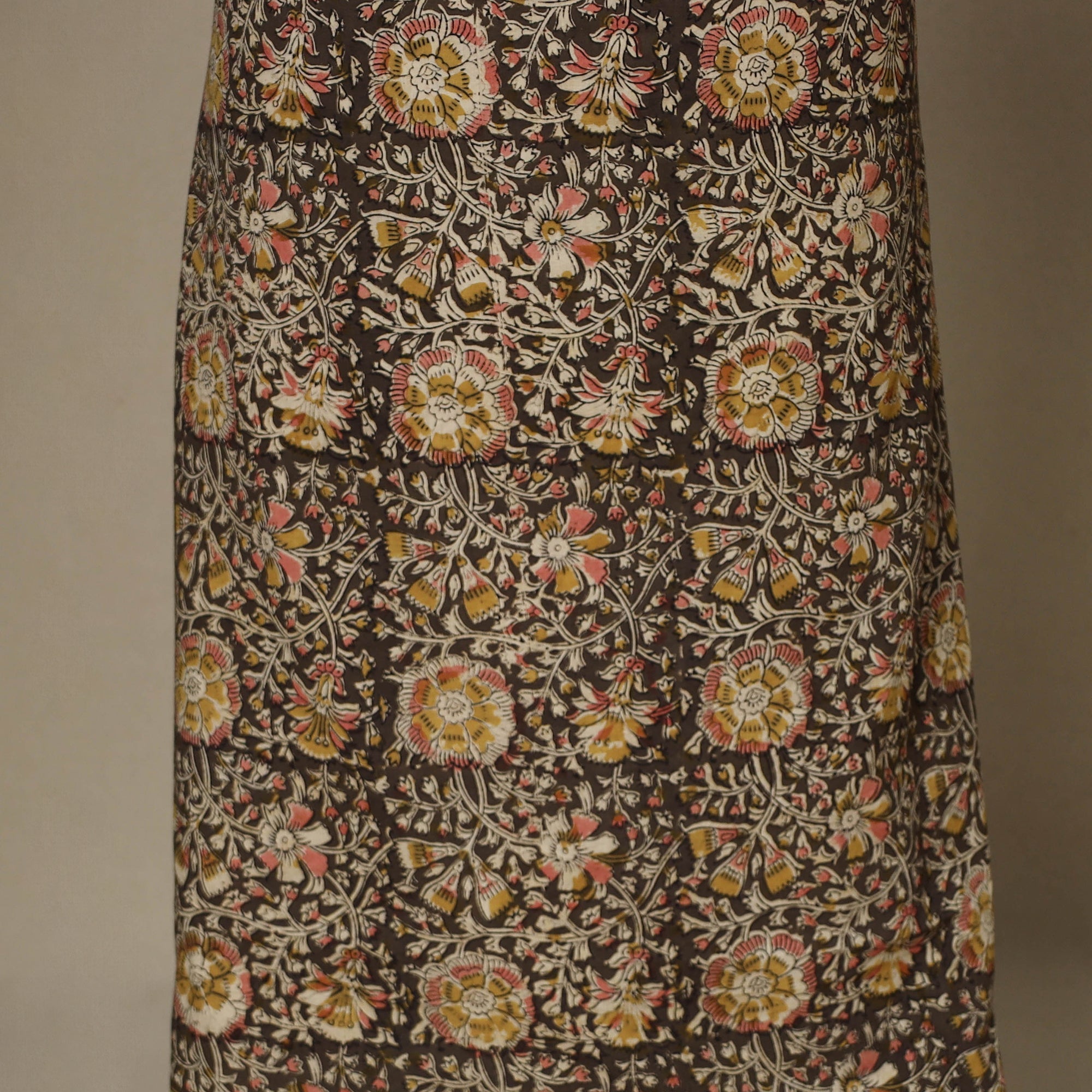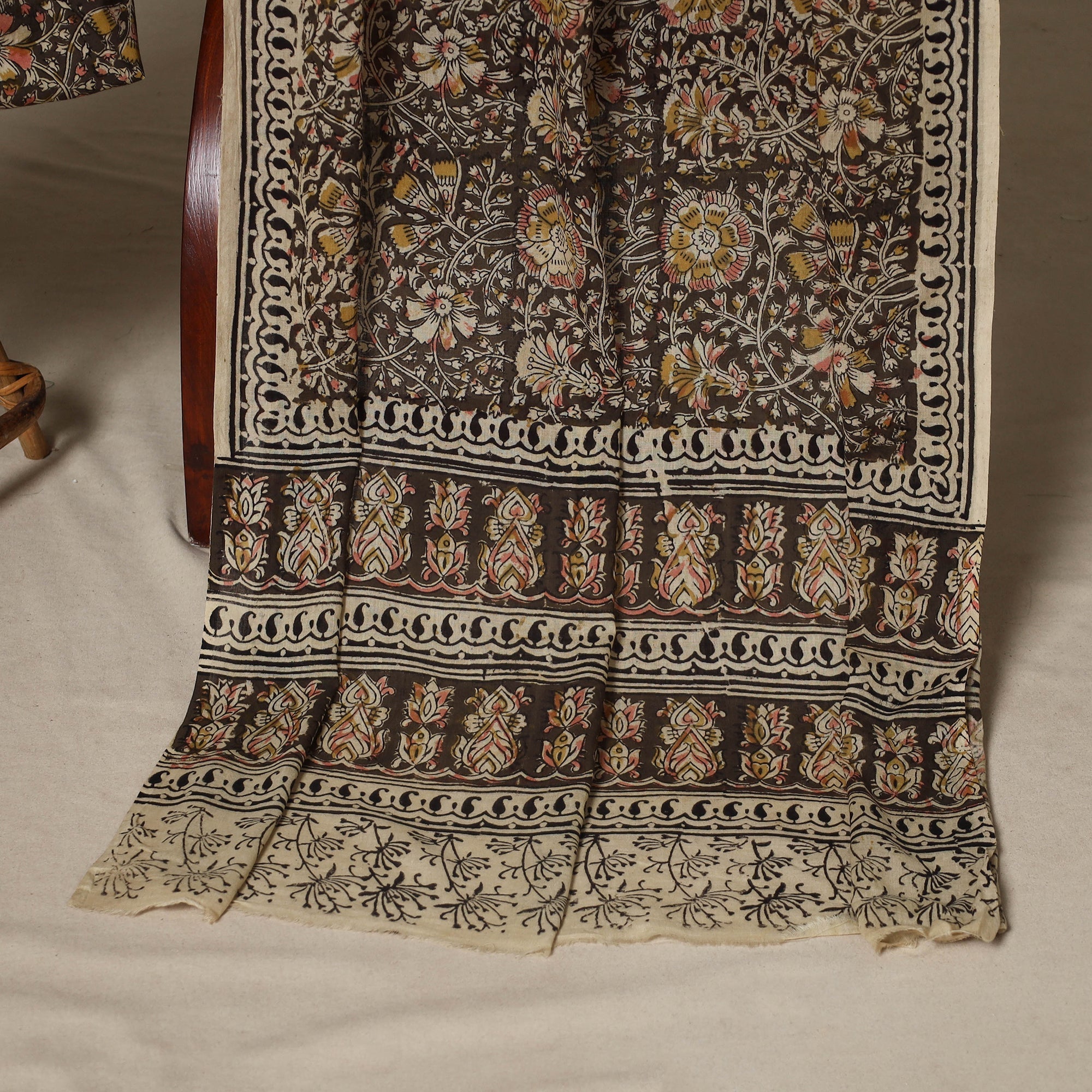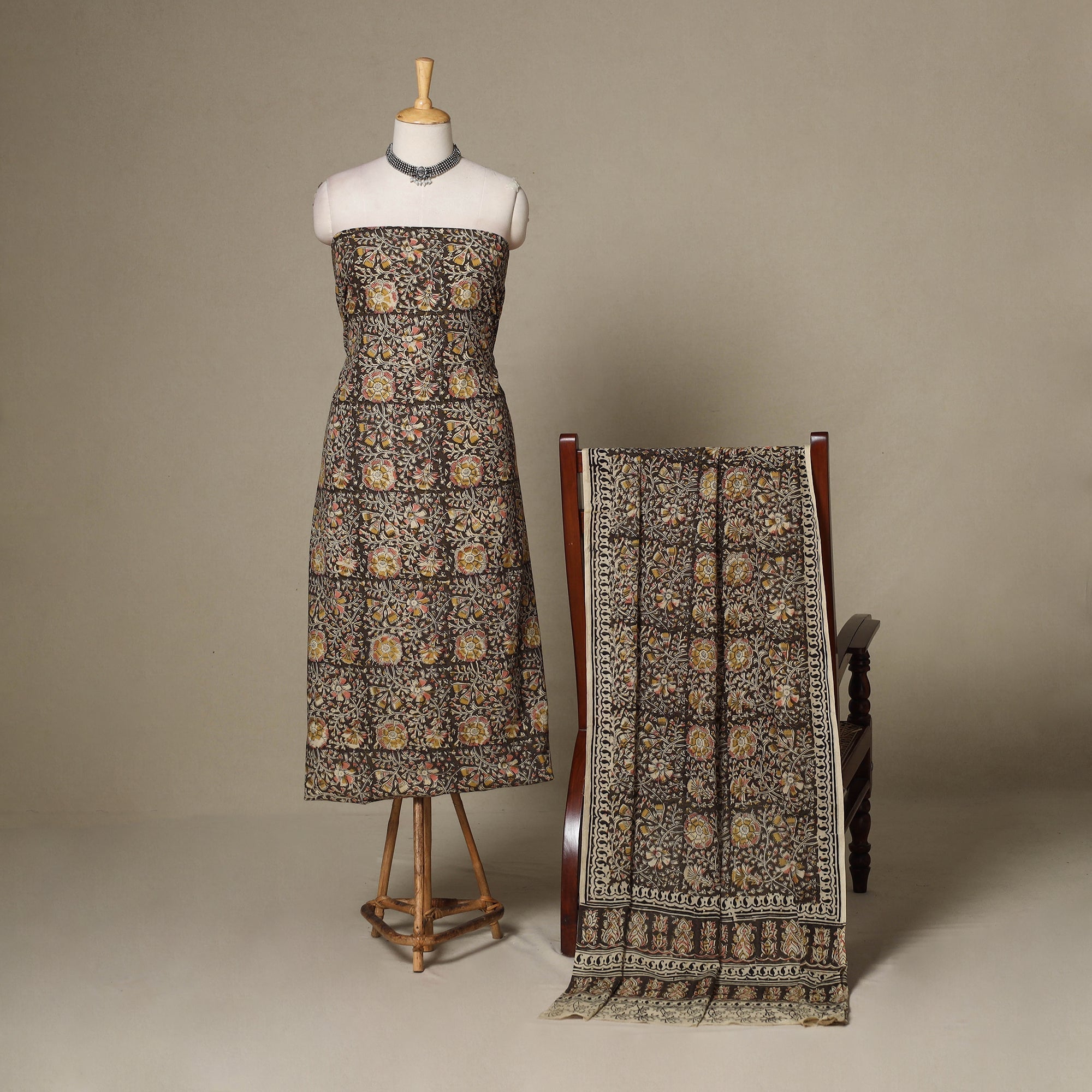 Discover the charm of brown kalamkari hand block printing in this 2pc cotton dress material set. Made with natural dyes and carved wooden blocks, it captures the grace of traditional Indian textile artistry. This set features a delicately printed kurta fabric with a coordinated dupatta, combining breathable comfort with heritage-rich elegance.