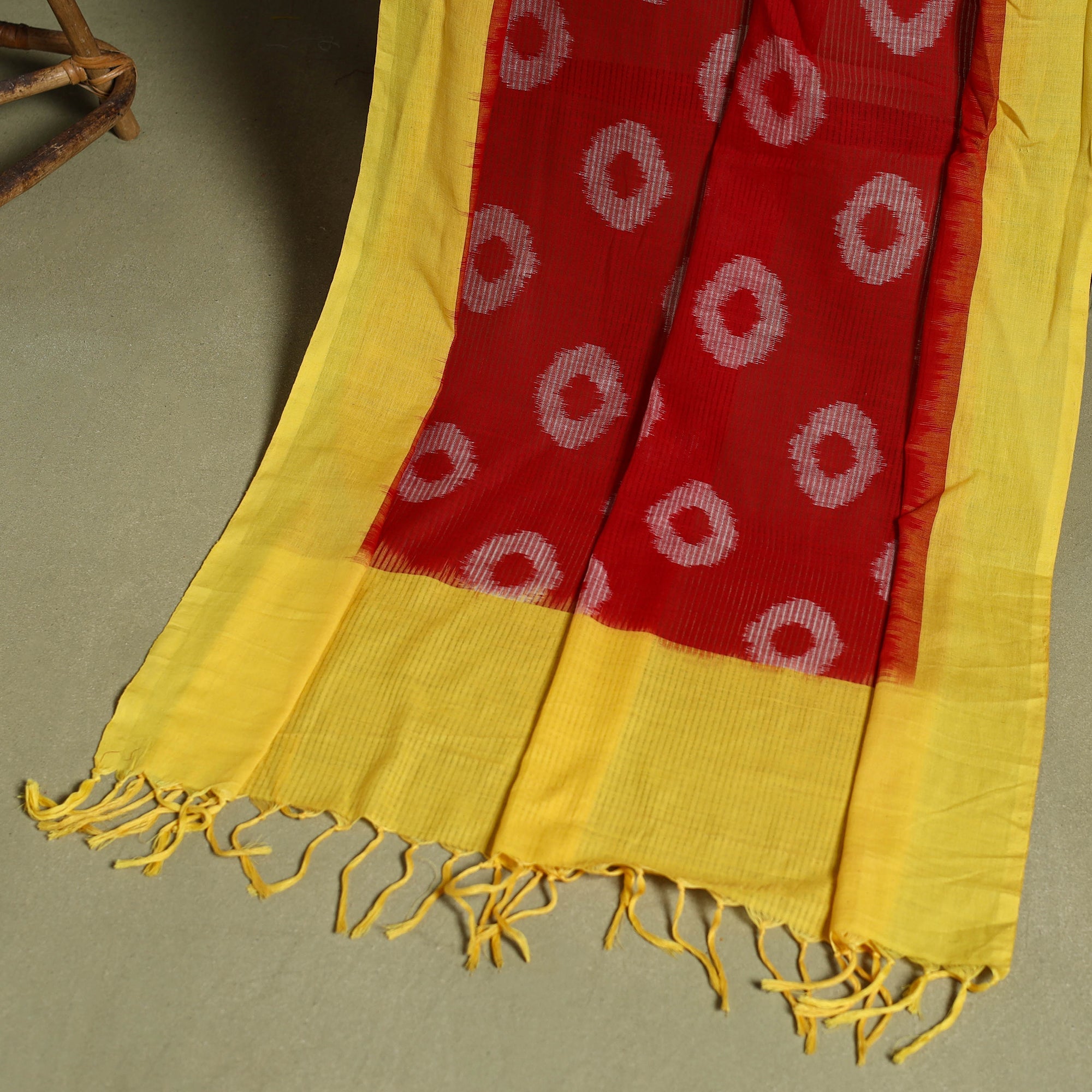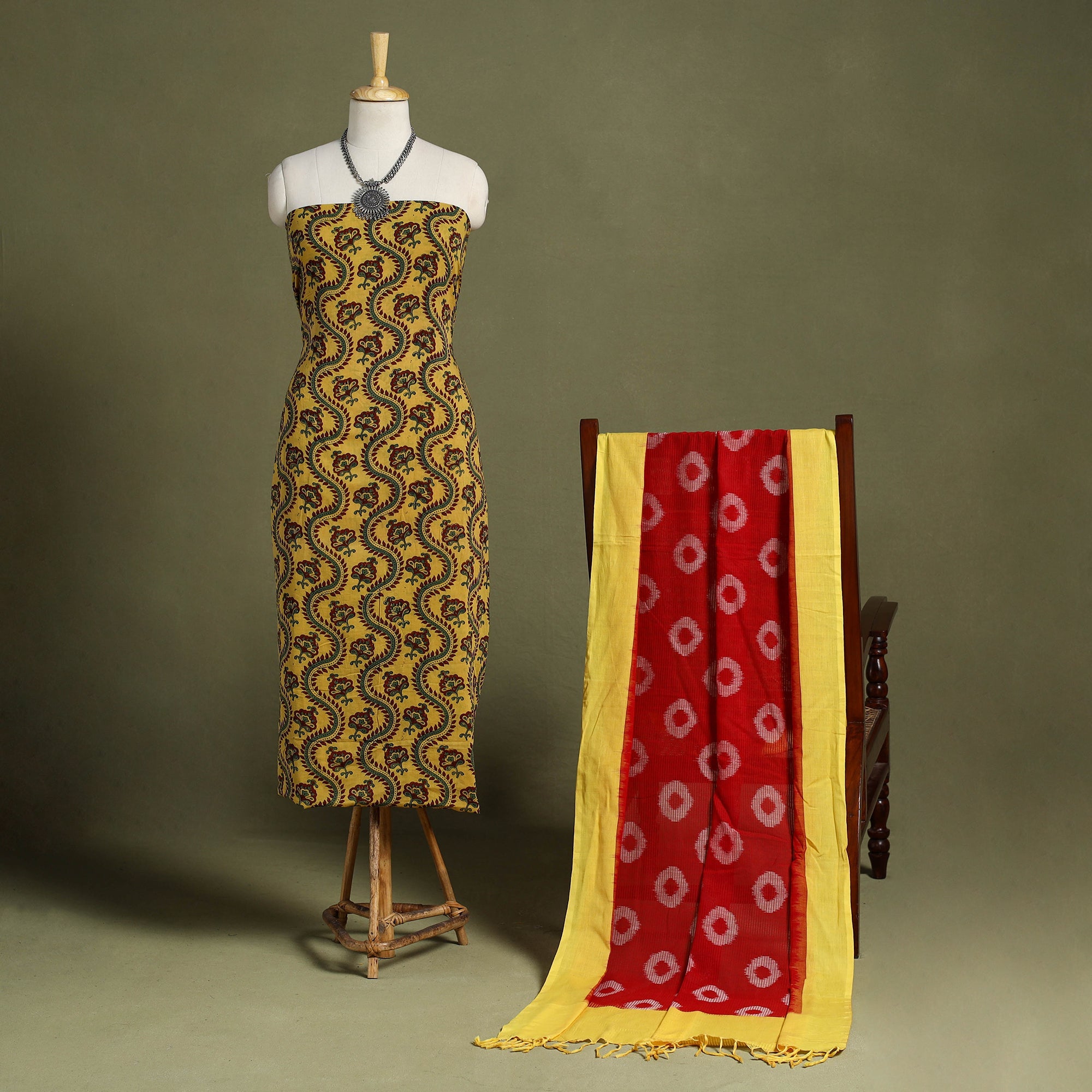 This 2pc set blends with two crafts, an yellow ajrakh print cotton kurta and an ikat dupatta. The kurta showcases traditional ajrakh block printing from Kutch, made using natural dyes, while the dupatta features intricate pochampally Ikat weaving. Perfect for weddings, festivals, or everyday elegance. Style it your way and celebrate the heritage of Indian textiles.