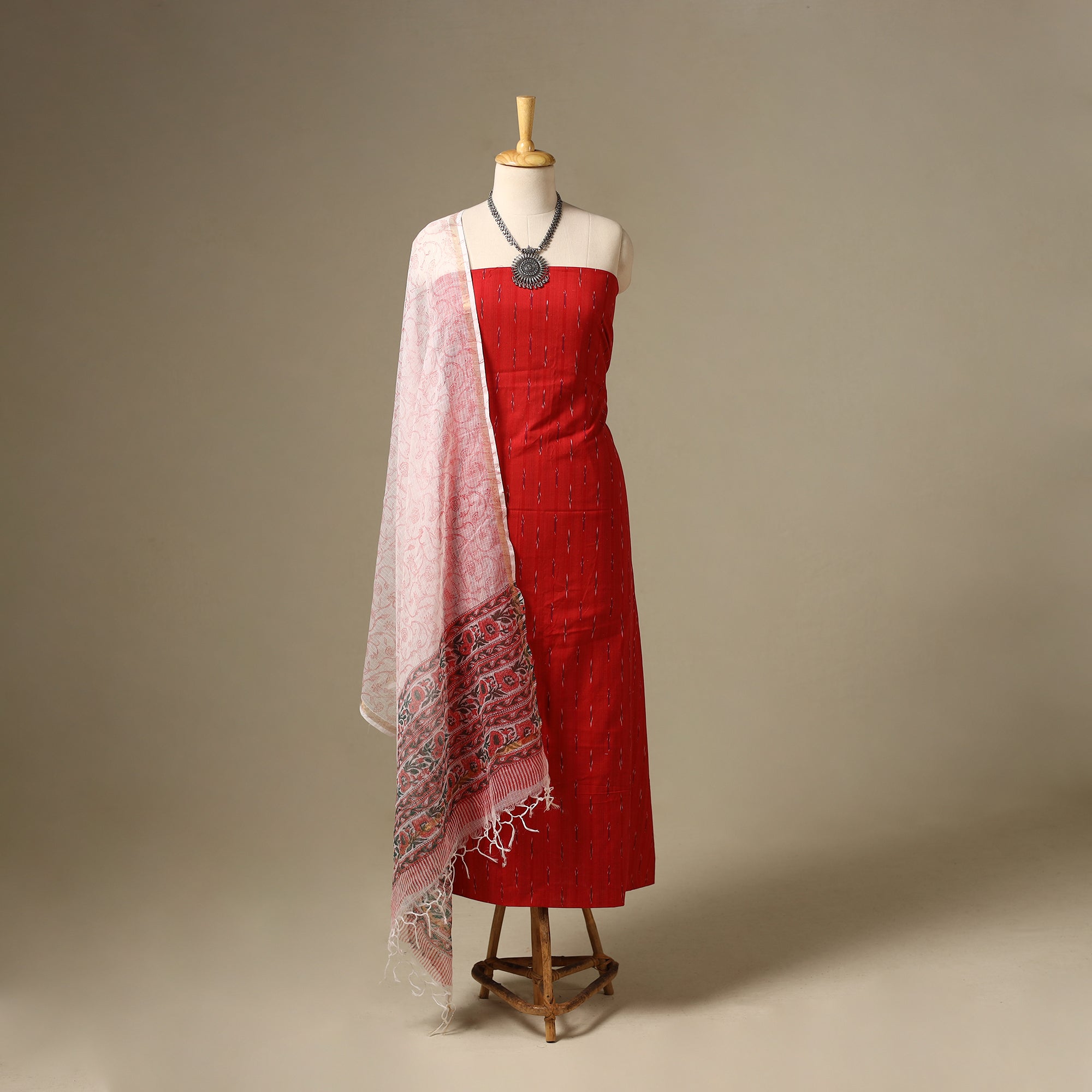 The 2pc cotton red ikat kurta with sanganeri dupatta beautifully blends tradition and elegance. This set is crafted from pochampally ikat cotton, showcasing the vibrant and intricate weaving technique. Paired with a beautiful sanganeri block print kota doria cotton zari border dupatta, it’s perfect for weddings, festivals, or family gatherings.