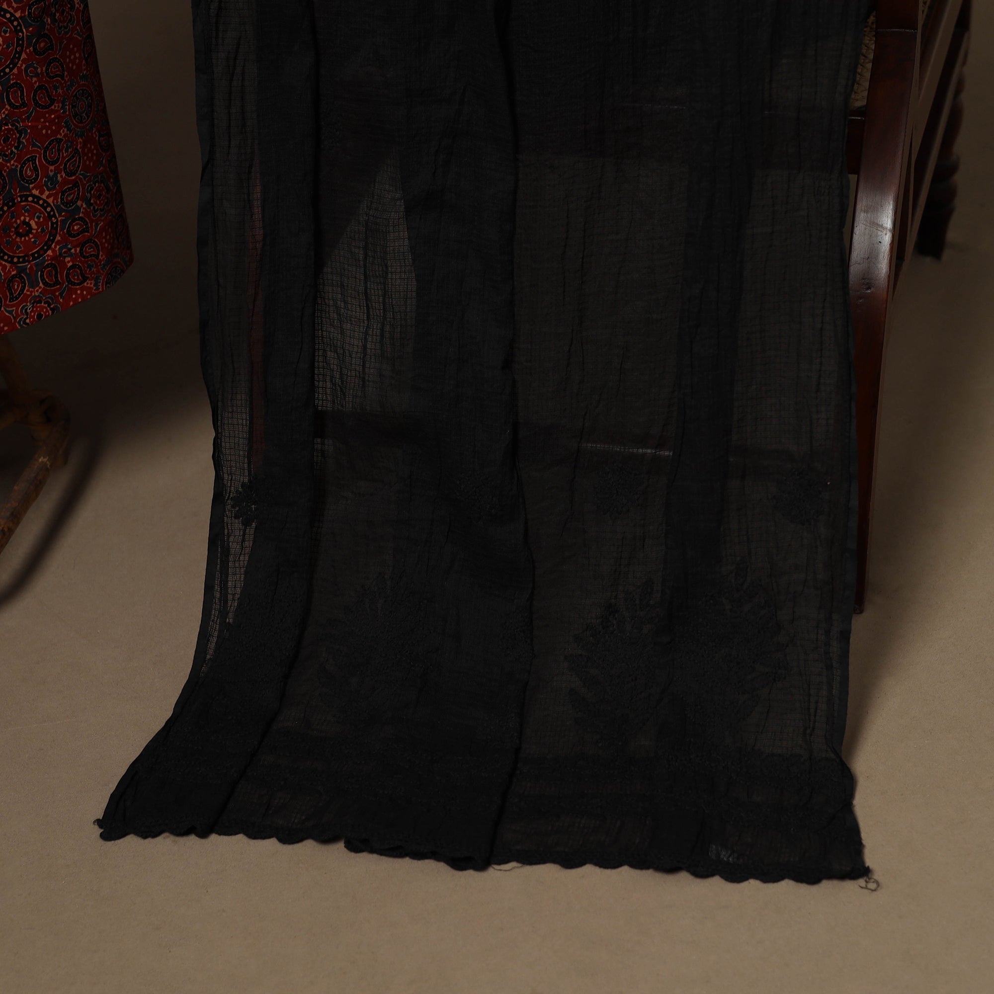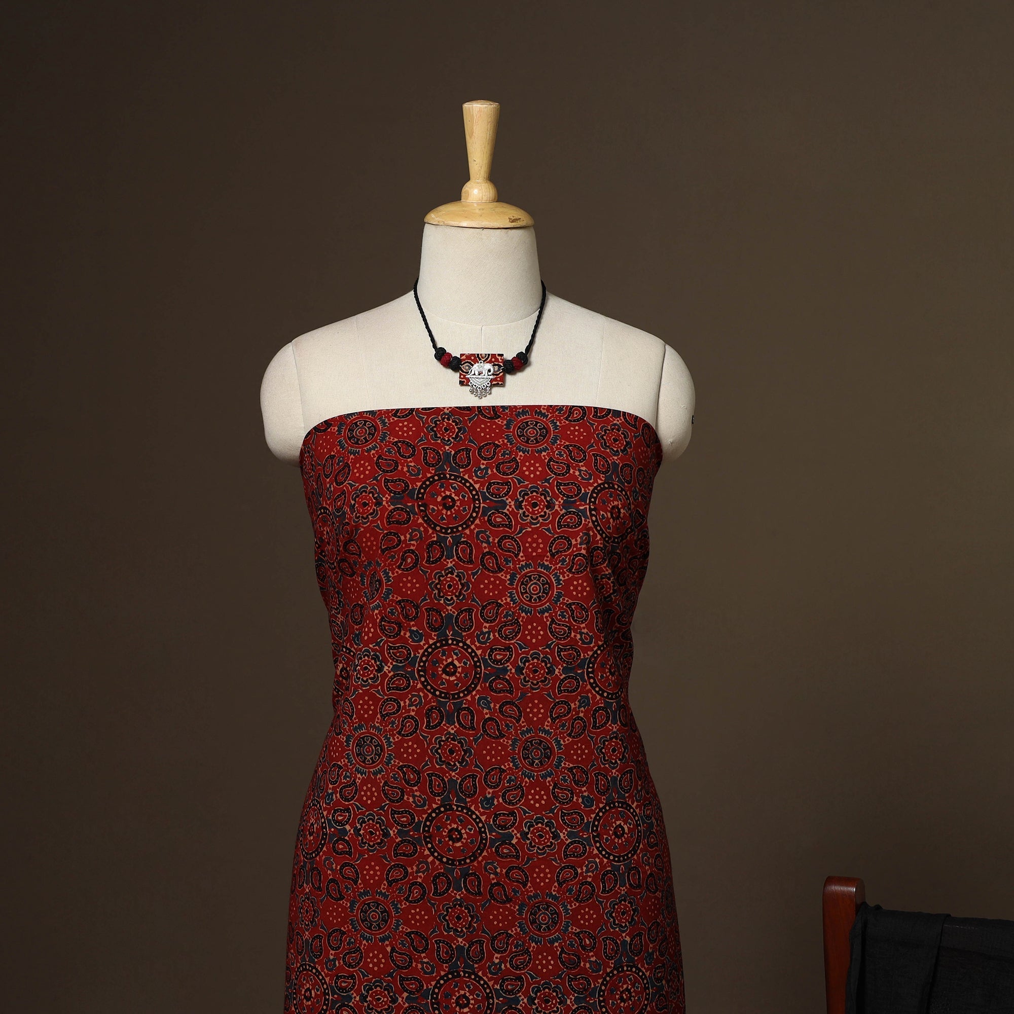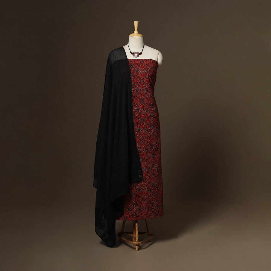 Traditional red 2pc unstitched dress material set to your wardrobe. It includes a ajrakh block print natural dyed cotton kurta fabric, paired with a lucknowi chikankari hand embroidered kota doria cotton dupatta. The set also comes with a handcrafted necklace and matching earrings to complete your look perfect for festive, events family gatherings or special occasions.