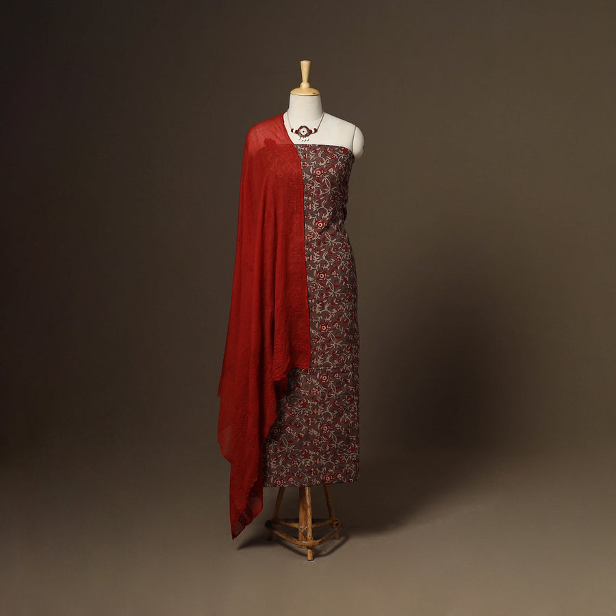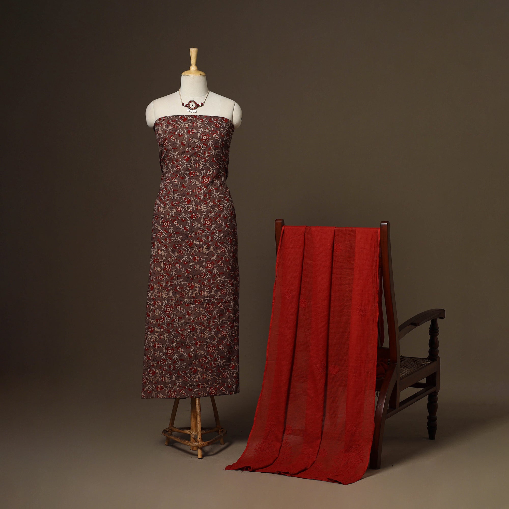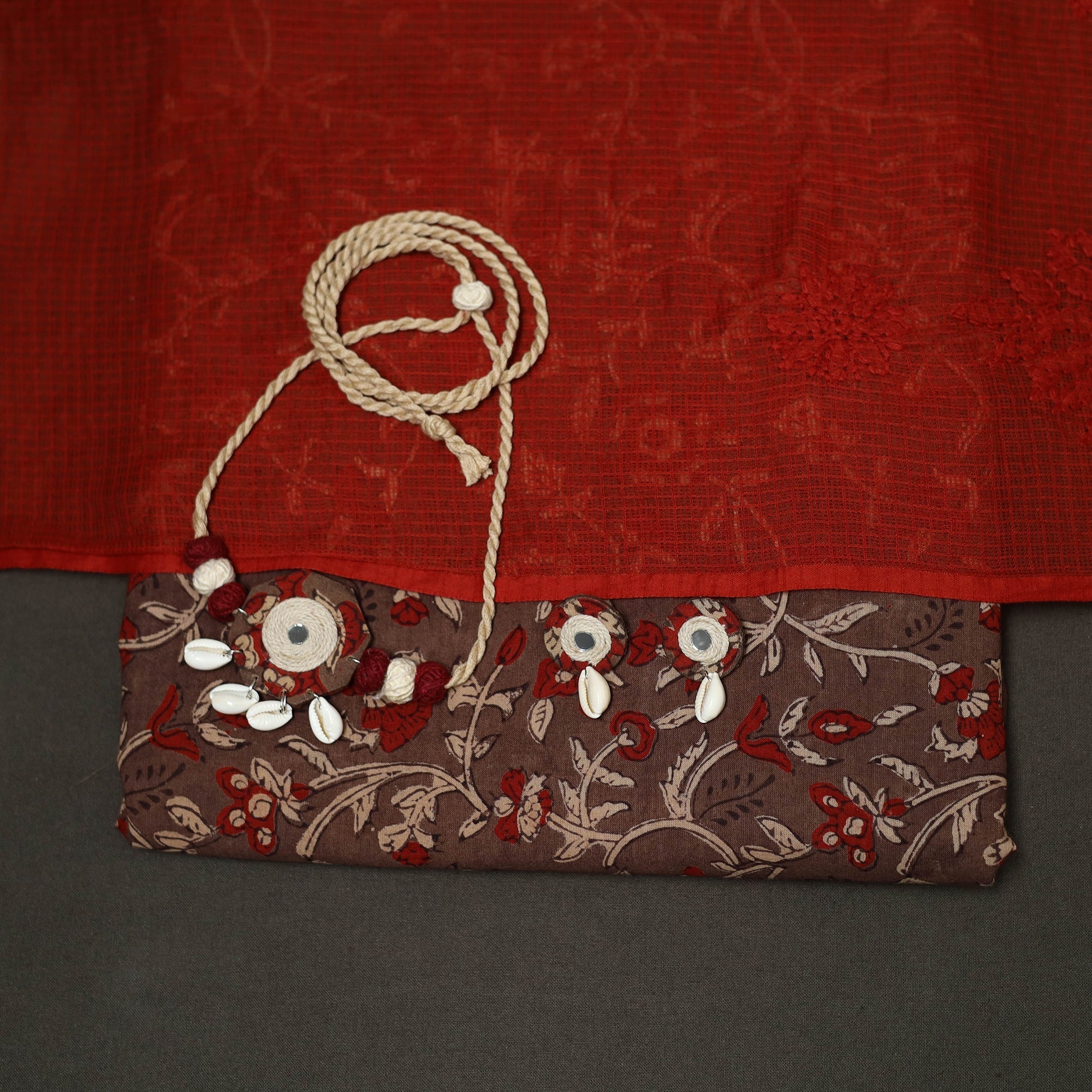 Traditional brown 2pc unstitched dress material set to your wardrobe. It includes a ajrakh block print natural dyed cotton kurta fabric, paired with a lucknowi chikankari hand embroidered kota doria cotton dupatta. The set also comes with a handcrafted necklace and matching earrings to complete your look perfect for festive, events family gatherings or special occasions.