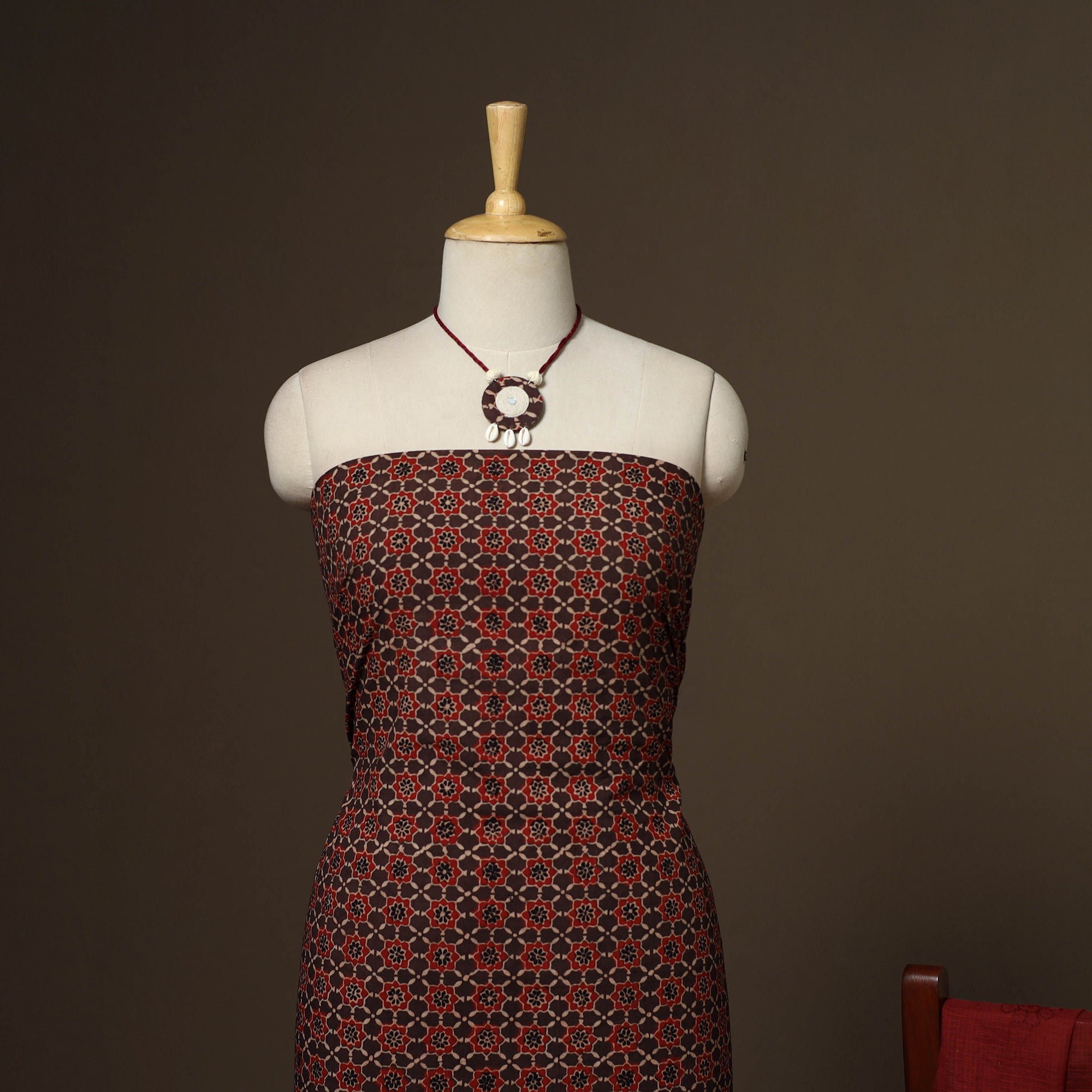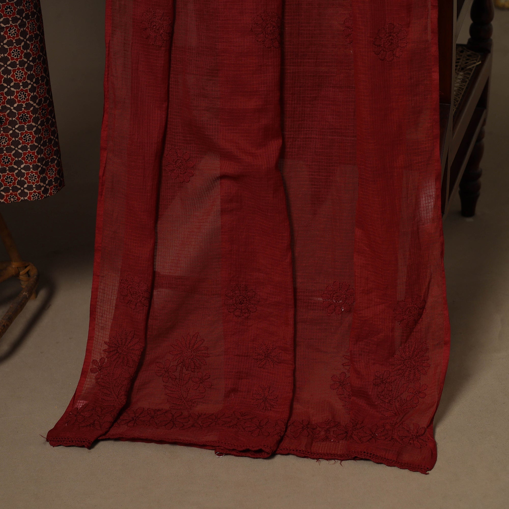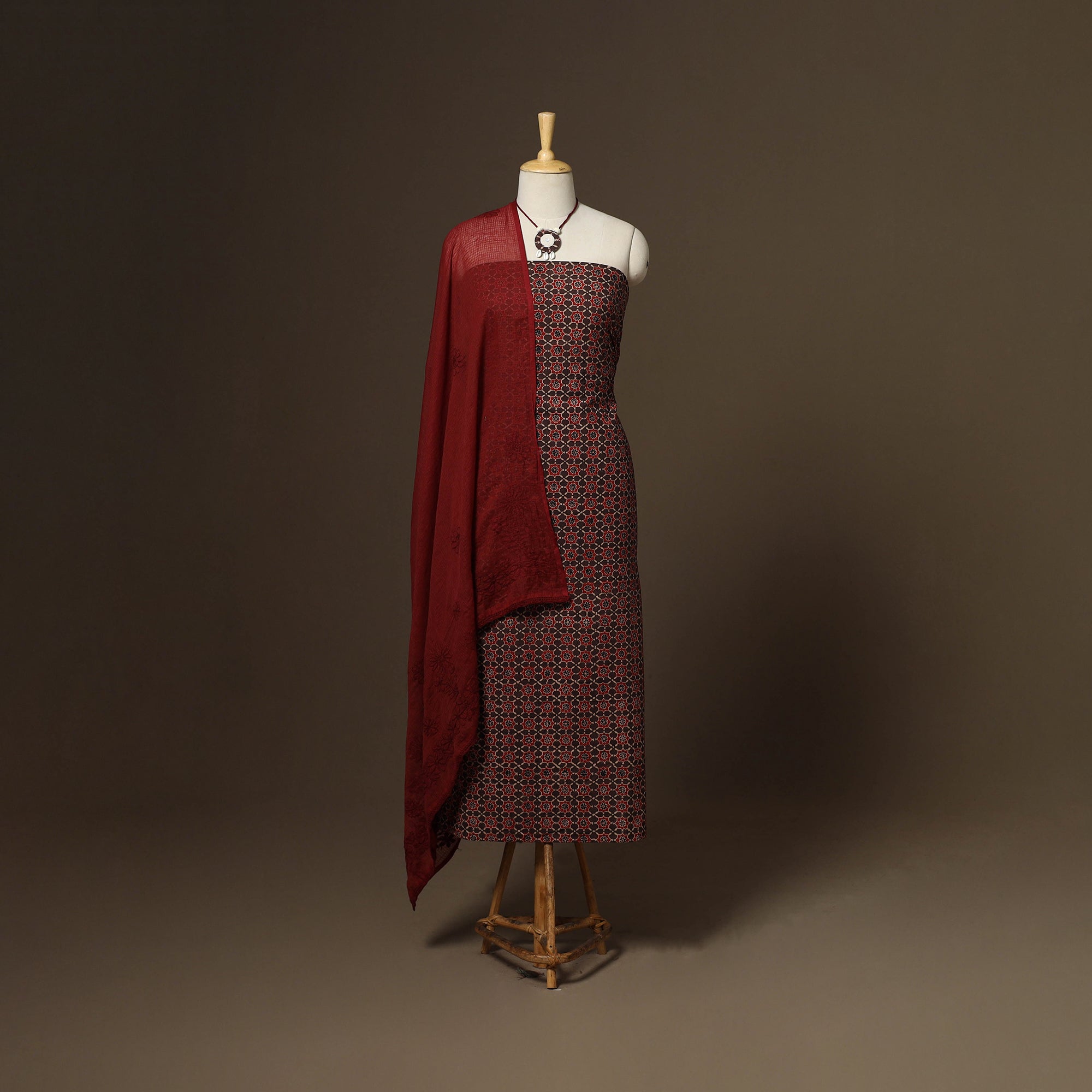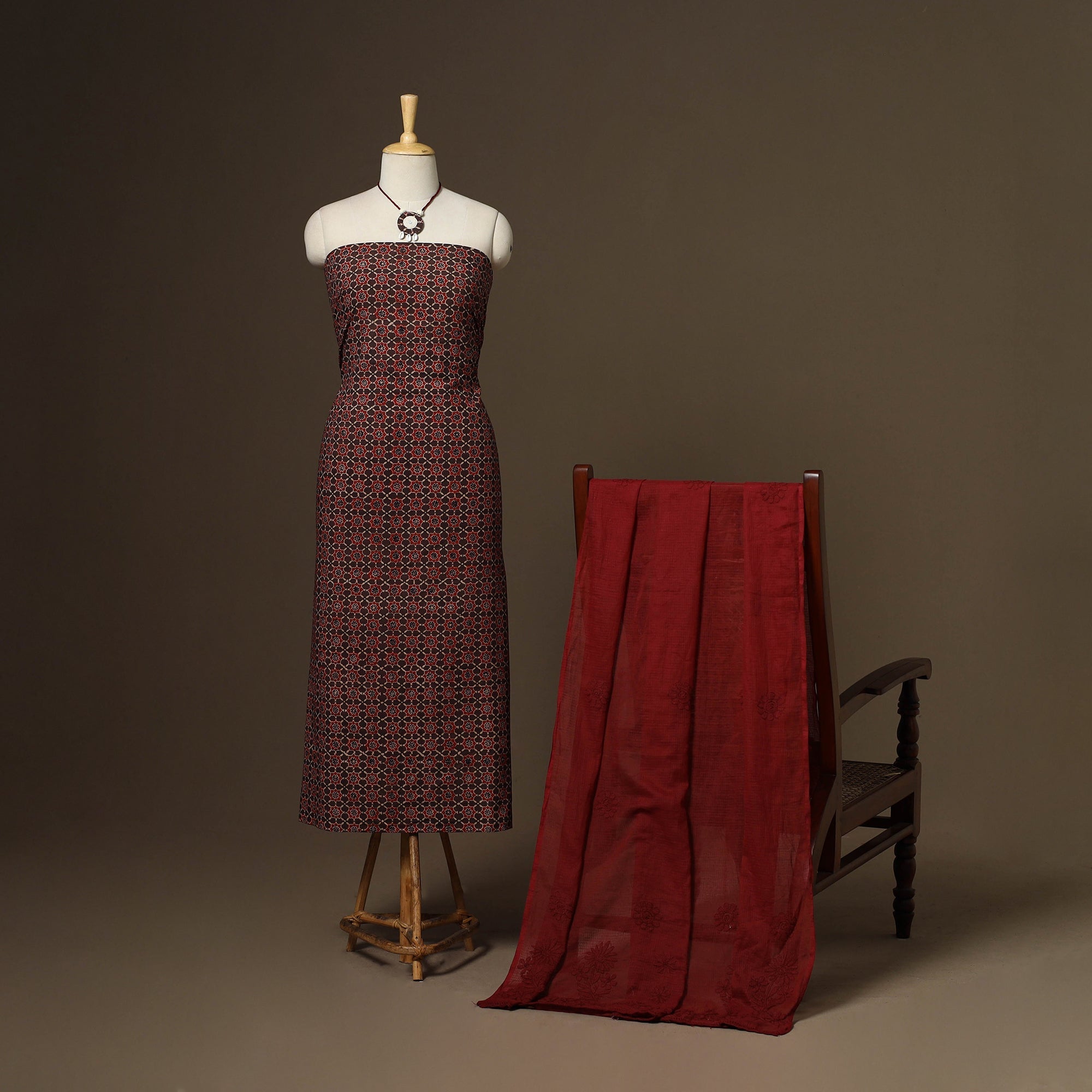 Traditional red 2pc unstitched dress material set to your wardrobe. It includes a ajrakh block print natural dyed cotton kurta fabric, paired with a lucknowi chikankari hand embroidered kota doria cotton dupatta. The set also comes with a handcrafted necklace and matching earrings to complete your look perfect for festive, events family gatherings or special occasions.