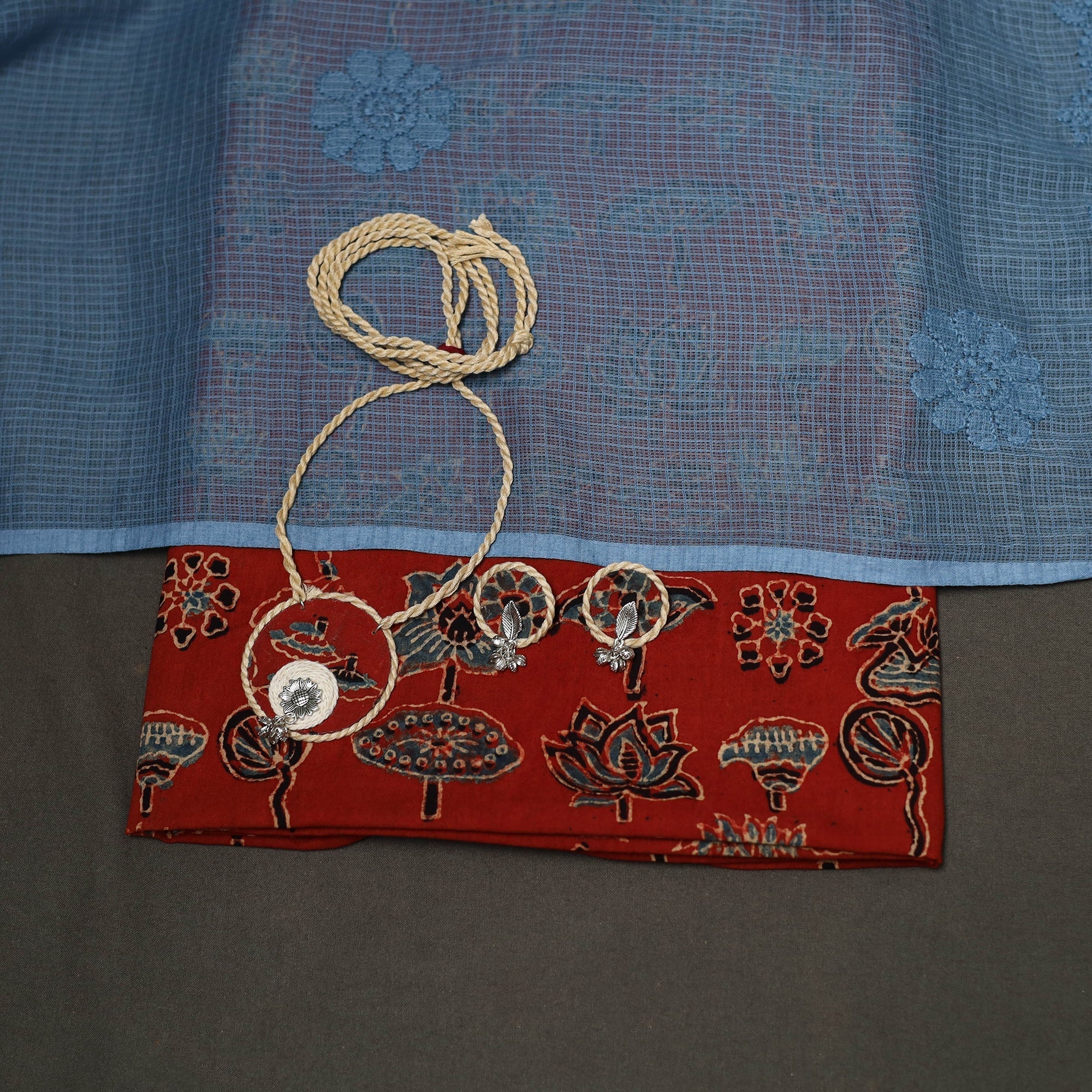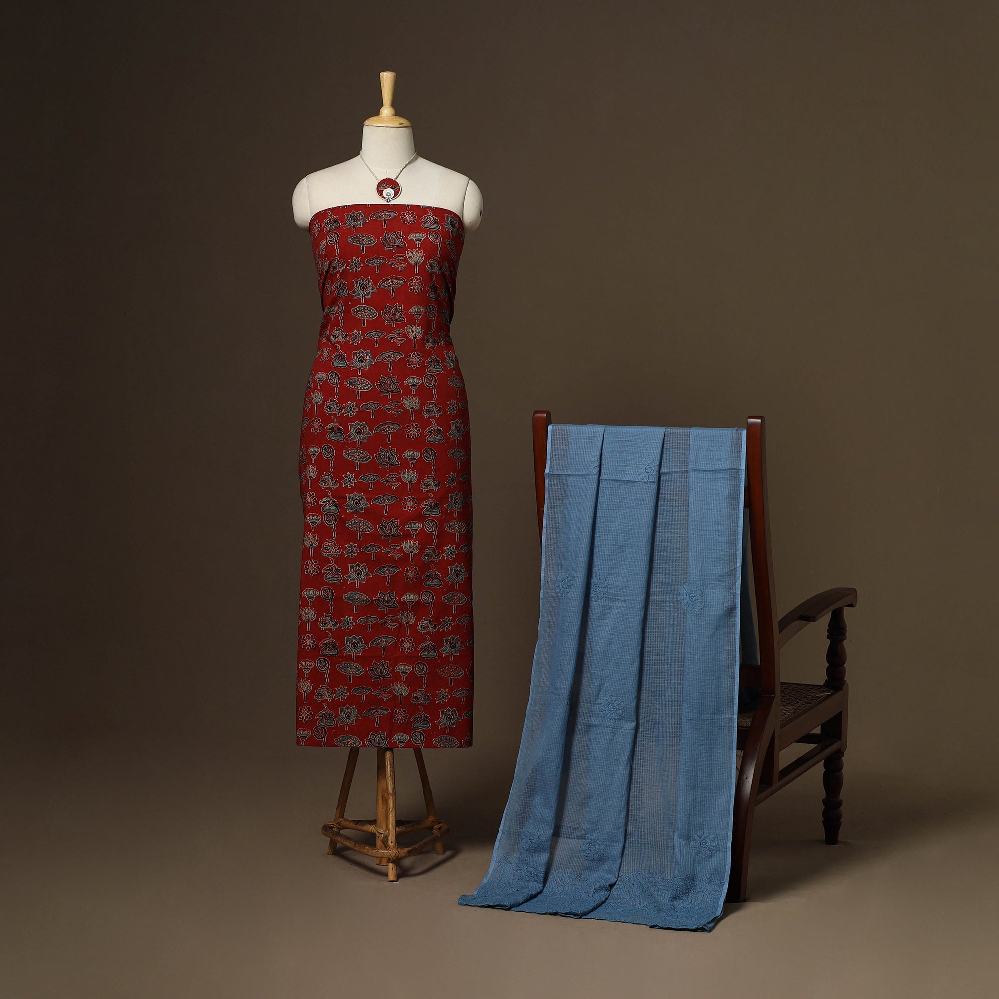 Traditional red 2pc unstitched dress material set to your wardrobe. It includes a ajrakh block print natural dyed cotton kurta fabric, paired with a lucknowi chikankari hand embroidered kota doria cotton dupatta. The set also comes with a handcrafted necklace and matching earrings to complete your look perfect for festive, events family gatherings or special occasions.