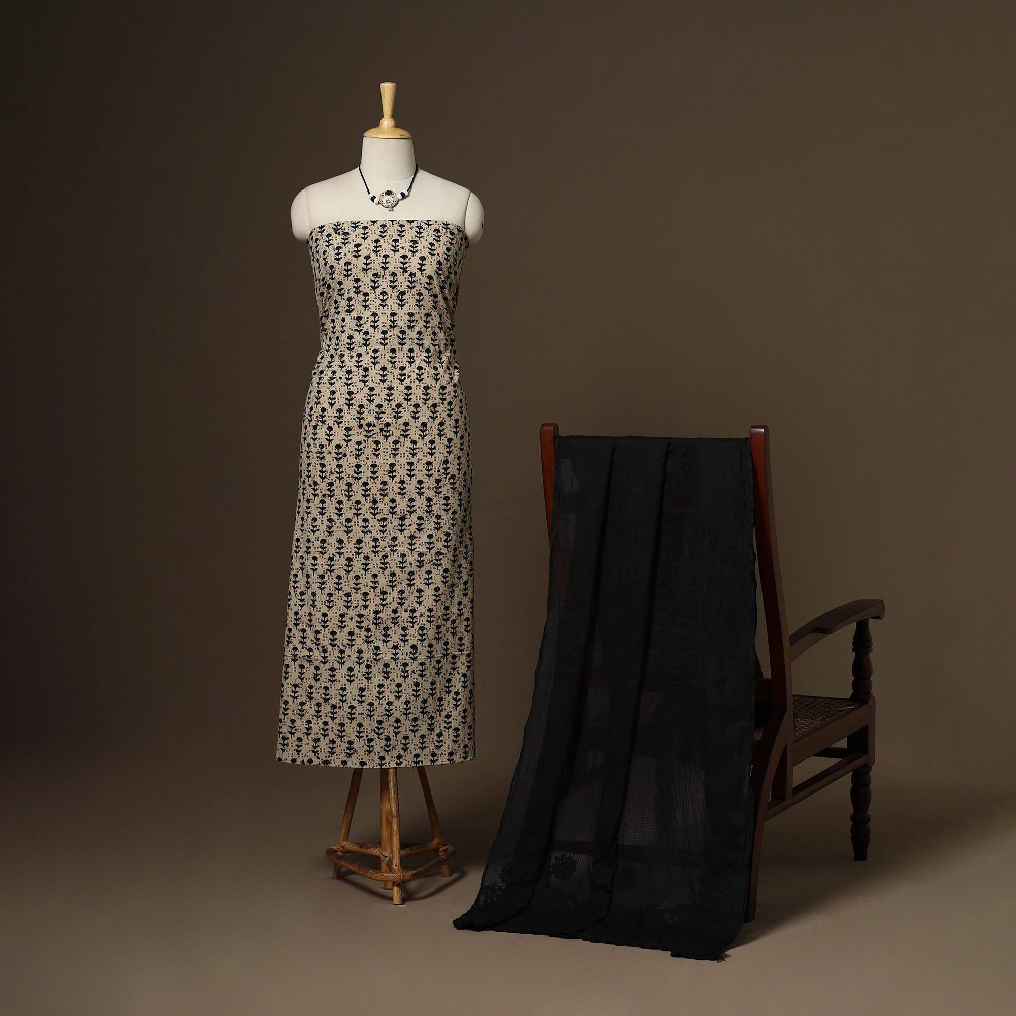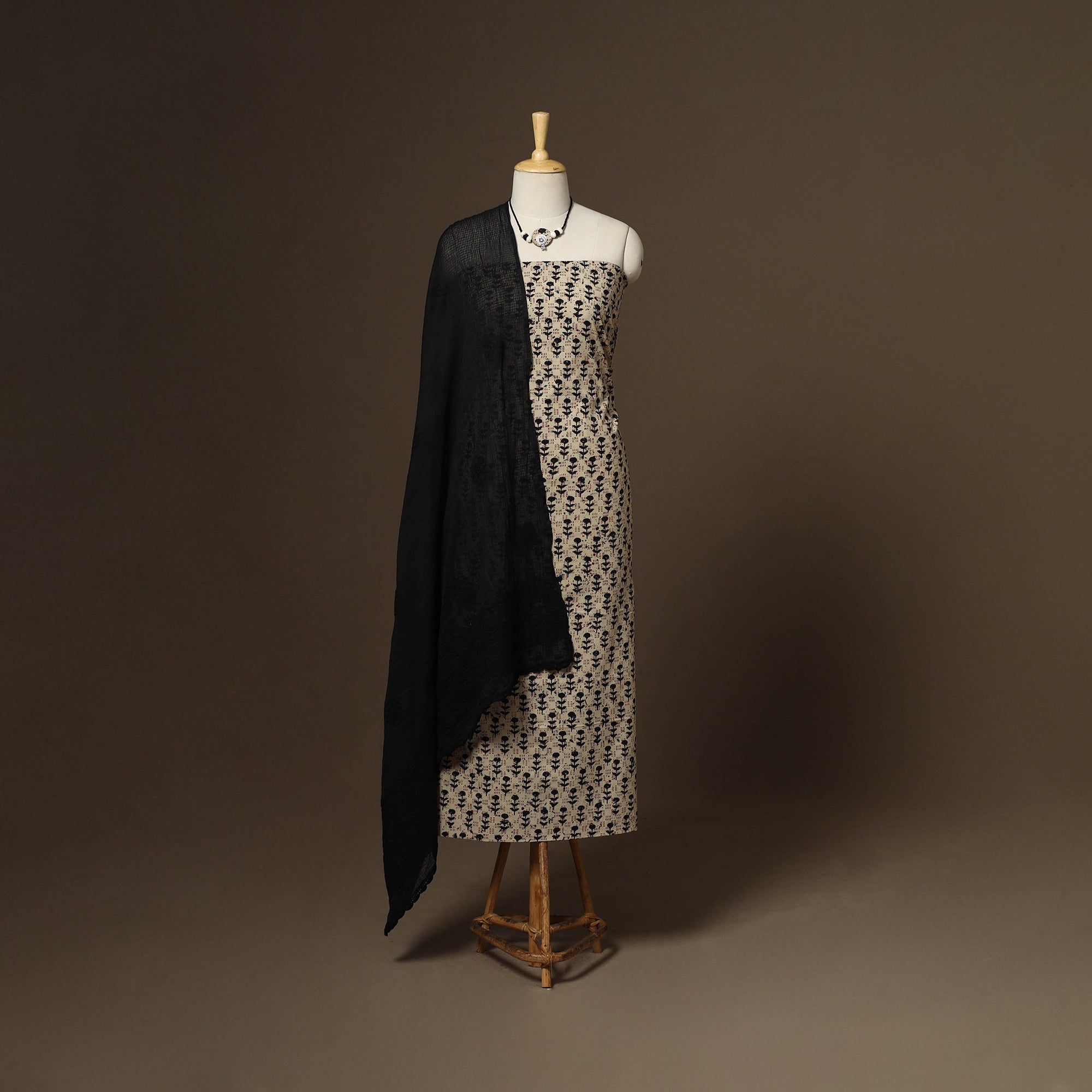 Traditional beige 2pc unstitched dress material set to your wardrobe. It includes a ajrakh block print natural dyed cotton kurta fabric, paired with a lucknowi chikankari hand embroidered kota doria cotton dupatta. The set also comes with a handcrafted necklace and matching earrings to complete your look perfect for festive, events family gatherings or special occasions.
