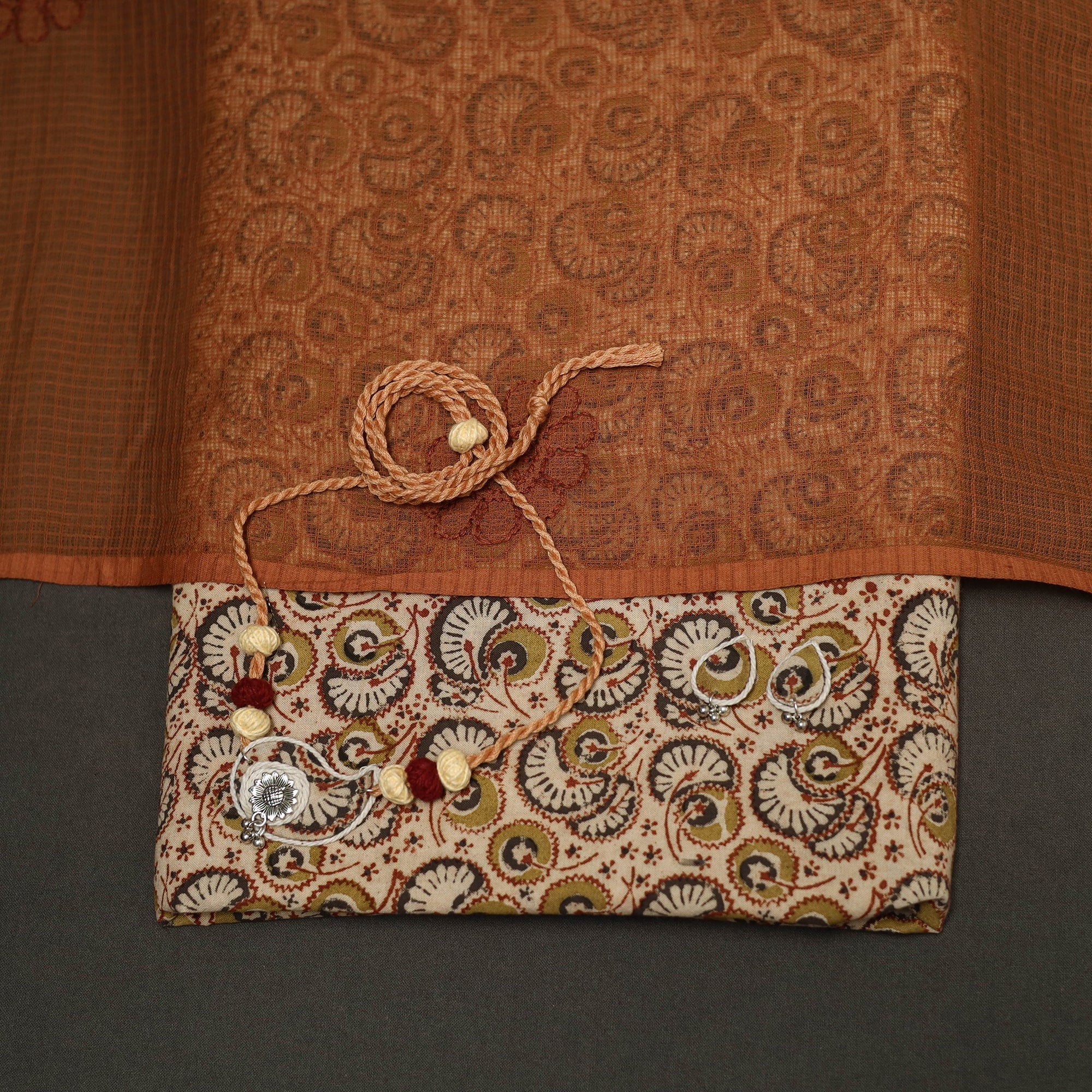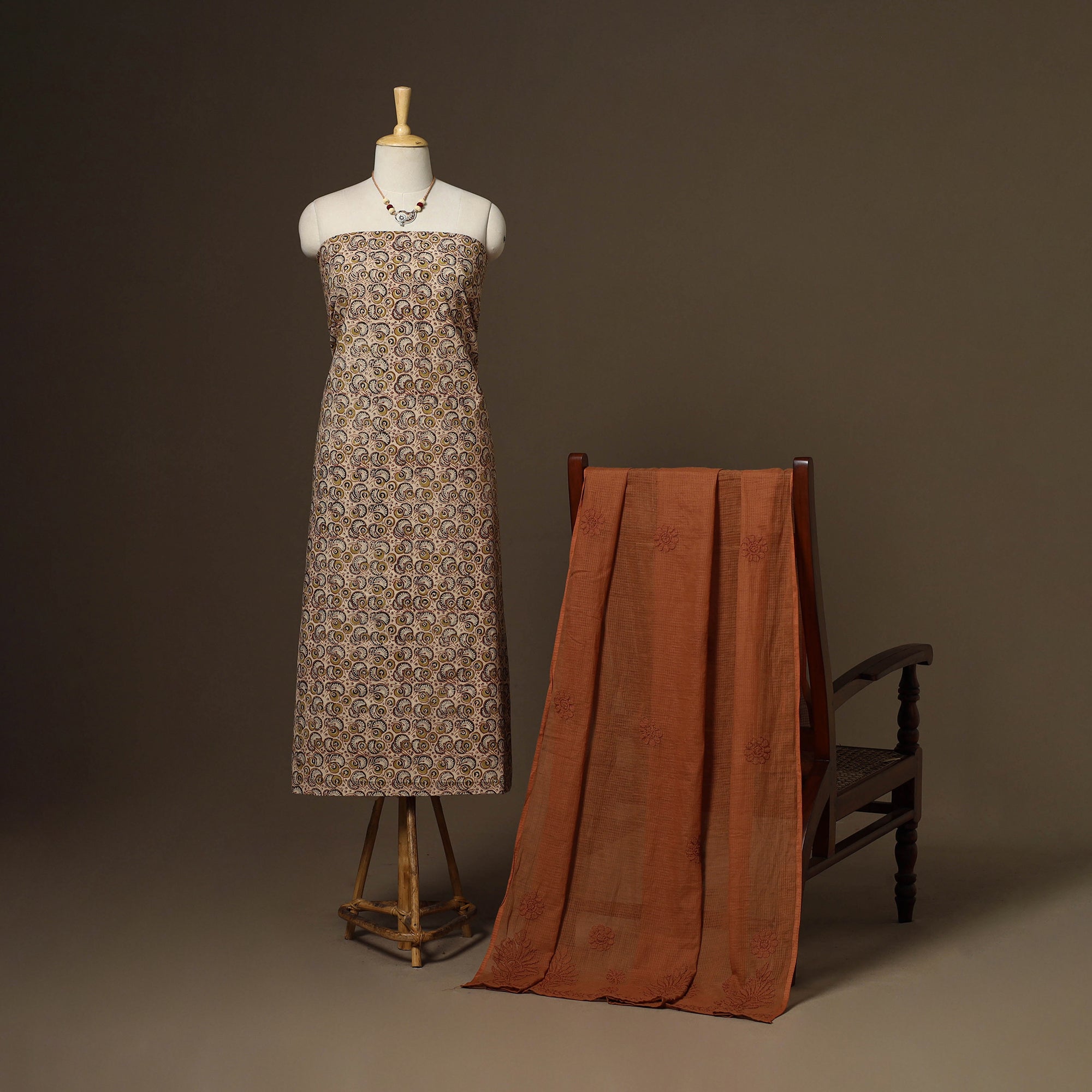 Traditional beige 2pc unstitched dress material set to your wardrobe. It includes a Pedana kalamkari block print natural dyed cotton kurta fabric, paired with a lucknowi chikankari hand embroidered kota doria cotton dupatta. The set also comes with a handcrafted necklace and matching earrings to complete your look, perfect for festive events, family gatherings or special occasions.