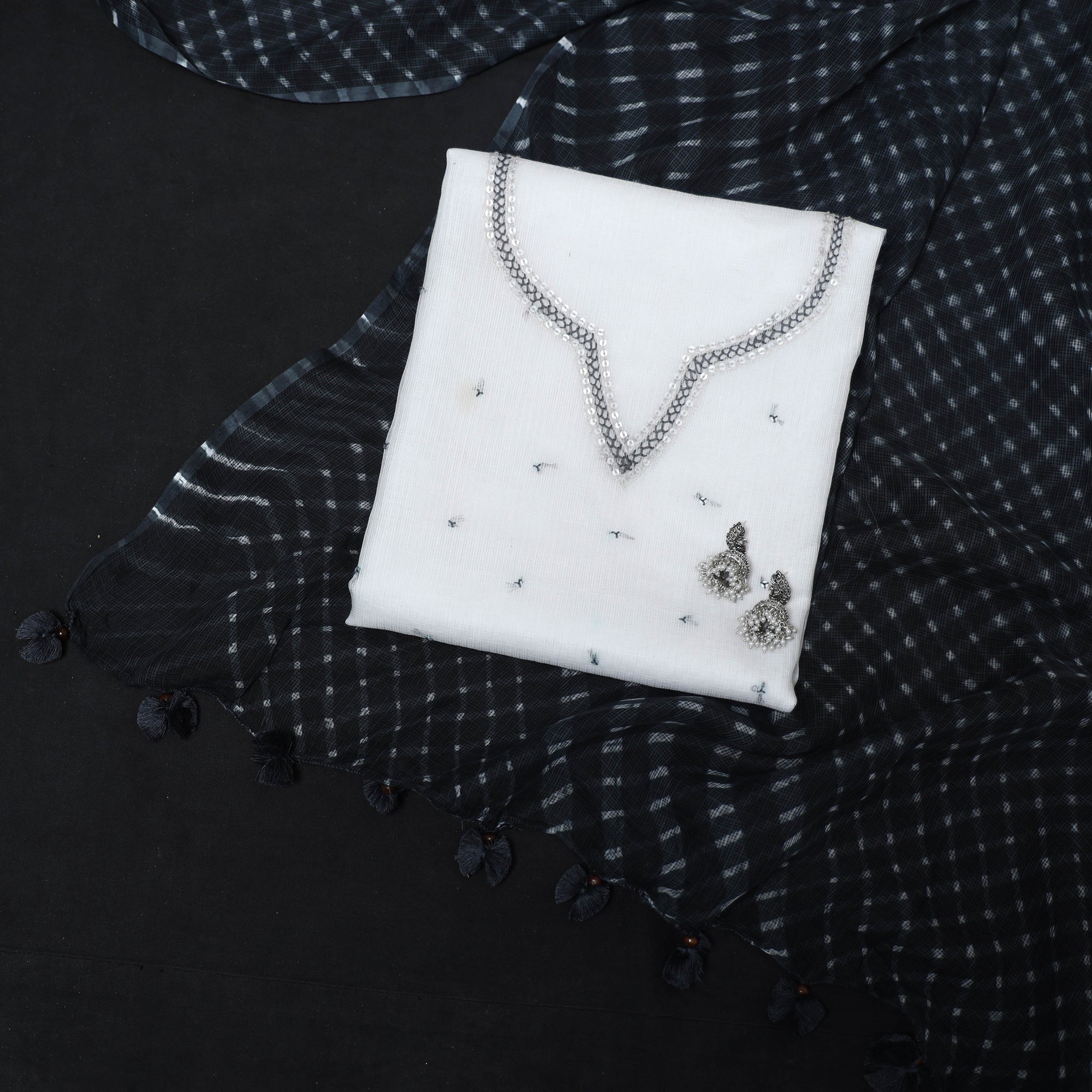 This white 2pc set includes a hand-embroidered kota doria cotton kurta paired with a leheriya kota doria cotton dupatta. It comes with matching earrings, adding refined ethnic charm to the look. Designed for both festive elegance and everyday comfort, it’s perfect for daily wear or as a meaningful gift, beautifully balancing tradition with modern grace.