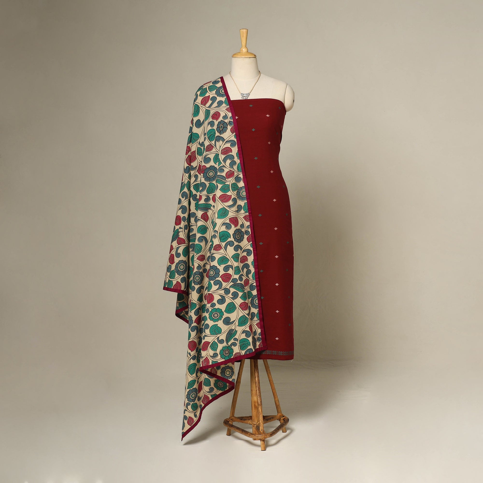This maroon 2pc set includes a jacquard weave cotton kurta paired with a kalamkari screen print cotton dupatta. It comes with matching necklace and earrings, adding refined ethnic charm to the look. Designed for both festive elegance and everyday comfort, it’s perfect for daily wear or as a meaningful gift, beautifully balancing tradition with modern grace.