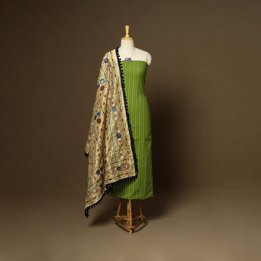 This green 2pc set includes a jacquard weave cotton kurta paired with a chanderi silk hand-embroidered phulkari dupatta. It comes with matching necklace and earrings, adding refined ethnic charm to the look. Designed for festive elegance as well as relaxed styling, it’s perfect for regular use or as a meaningful gift, beautifully balancing tradition with modern grace.