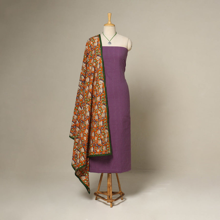 This purple 2pc set includes a jacquard weave cotton kurta paired with a kalamkari screen print cotton dupatta. It comes with matching necklace and earrings, adding refined ethnic charm to the look. Designed for both festive elegance and everyday comfort, it’s perfect for daily wear or as a meaningful gift, beautifully balancing tradition with modern grace.