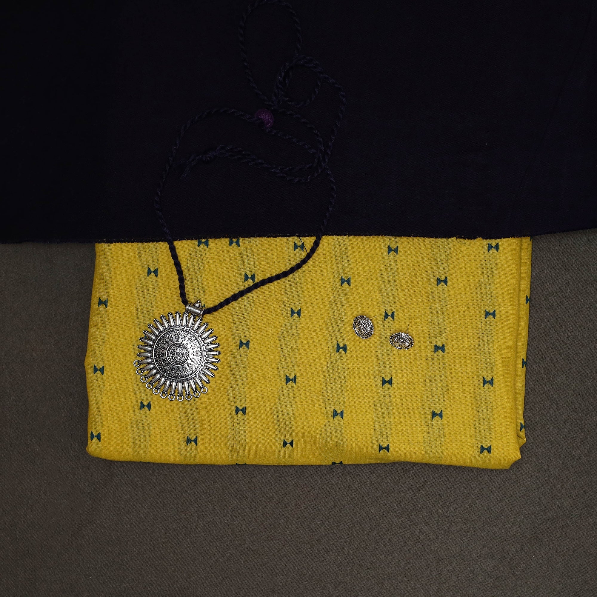Add a touch of tradition to your wardrobe with this yellow 2pc unstitched dress material set. It includes a jacquard weave cotton kurta fabric, paired with a kutch printed rayon dupatta. The set also comes with a handcrafted necklace and matching earrings to complete your look, perfect for festive events, family gatherings, or special occasions.