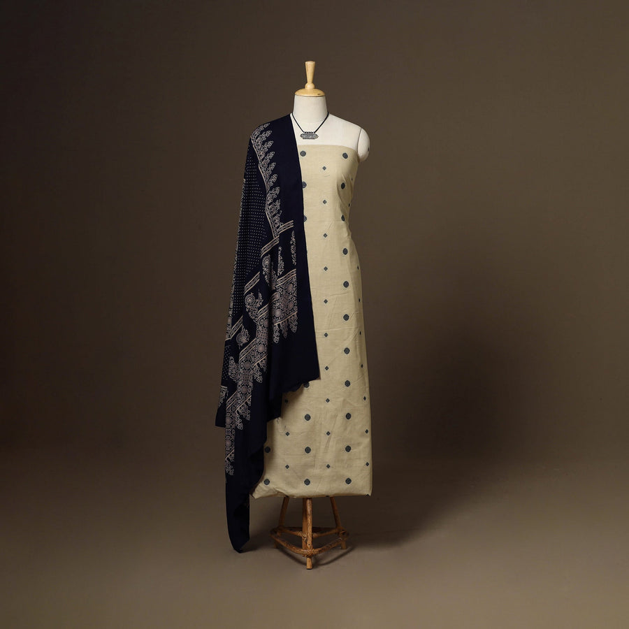 Add a touch of tradition to your wardrobe with this beige 2pc unstitched dress material set. It includes a jacquard weave cotton kurta fabric, paired with a kutch printed rayon dupatta. The set also comes with a handcrafted necklace and matching earrings to complete your look, perfect for festive events, family gatherings, or special occasions.