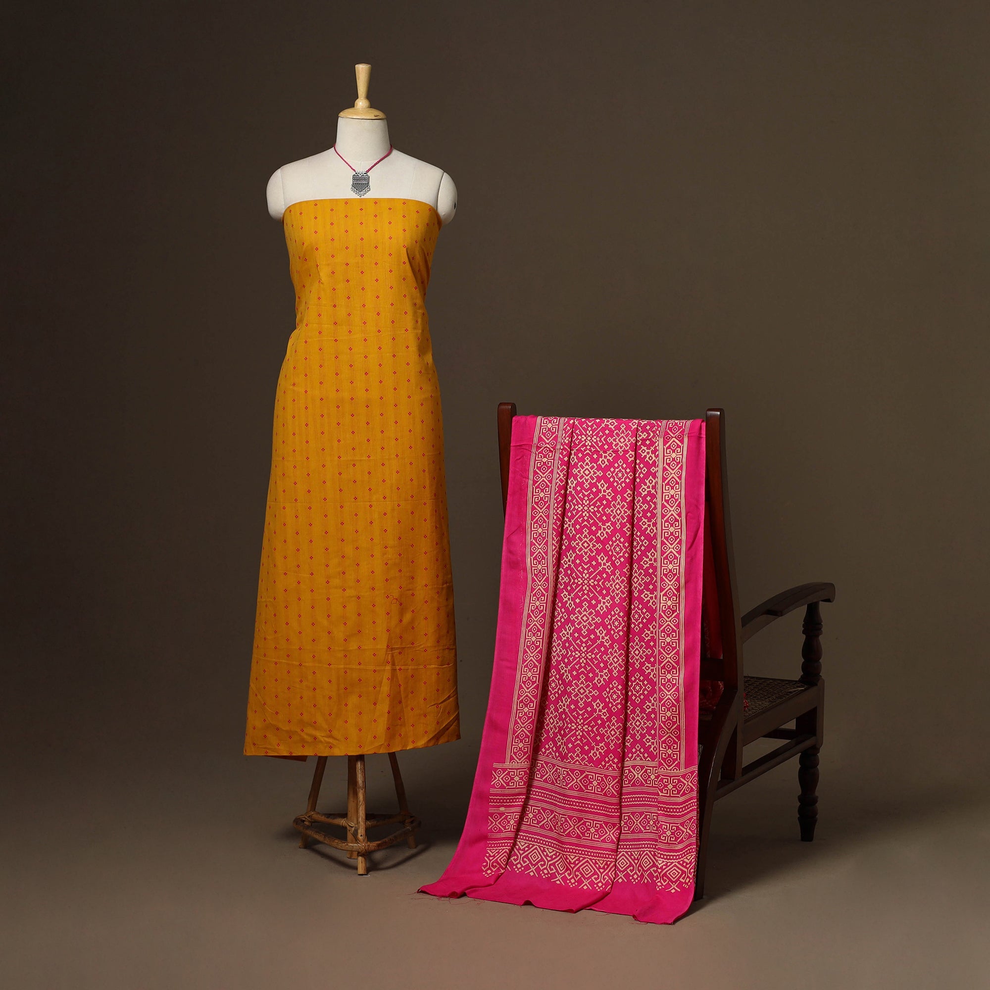 Add a touch of tradition to your wardrobe with this yellow 2pc unstitched dress material set. It includes a jacquard weave cotton kurta fabric, paired with a kutch printed rayon dupatta. The set also comes with a handcrafted necklace and matching earrings to complete your look, perfect for festive events, family gatherings, or special occasions.