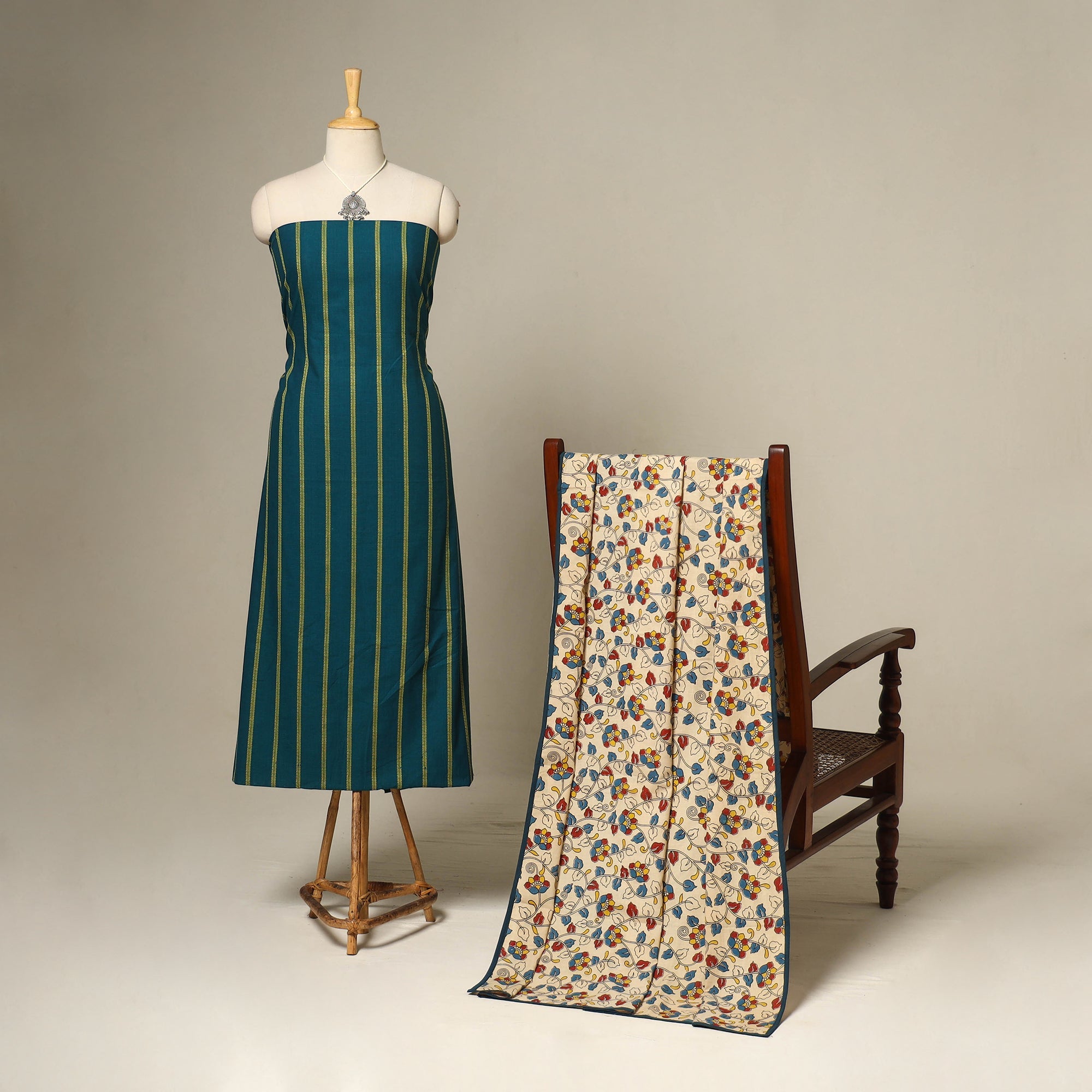 This blue 2pc set includes a jacquard weave cotton kurta paired with a kalamkari screen print cotton dupatta. It comes with matching necklace and earrings, adding refined ethnic charm to the look. Designed for both festive elegance and everyday comfort, it’s perfect for daily wear or as a meaningful gift, beautifully balancing tradition with modern grace.