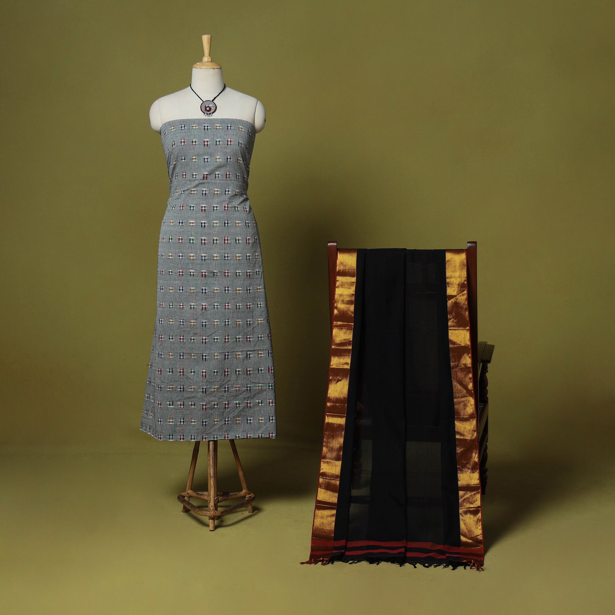 Featuring a grey pochampally double ikat cotton kurta with a dharwad cotton dupatta, this 2pc set comes complete with necklace and earrings for a graceful touch. The pairing celebrates regional weaving traditions while offering relaxed comfort. Perfect for workdays, festive gatherings, or gifting, it unites heritage detail with contemporary simplicity.