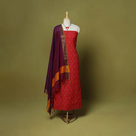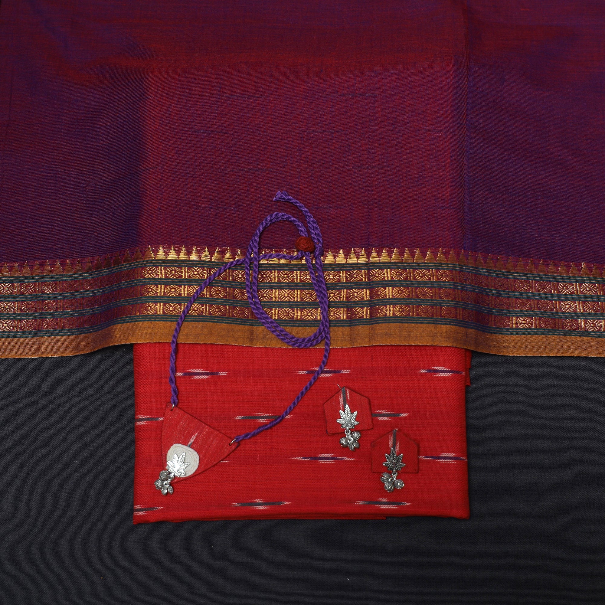 This red 2pc set includes a pochampally Ikat cotton kurta paired with a dharwad cotton dupatta. It comes with matching necklace and earrings, adding refined ethnic charm to the look. Designed for both festive elegance and everyday comfort, it’s perfect for daily wear or as a meaningful gift, beautifully balancing tradition with modern grace.