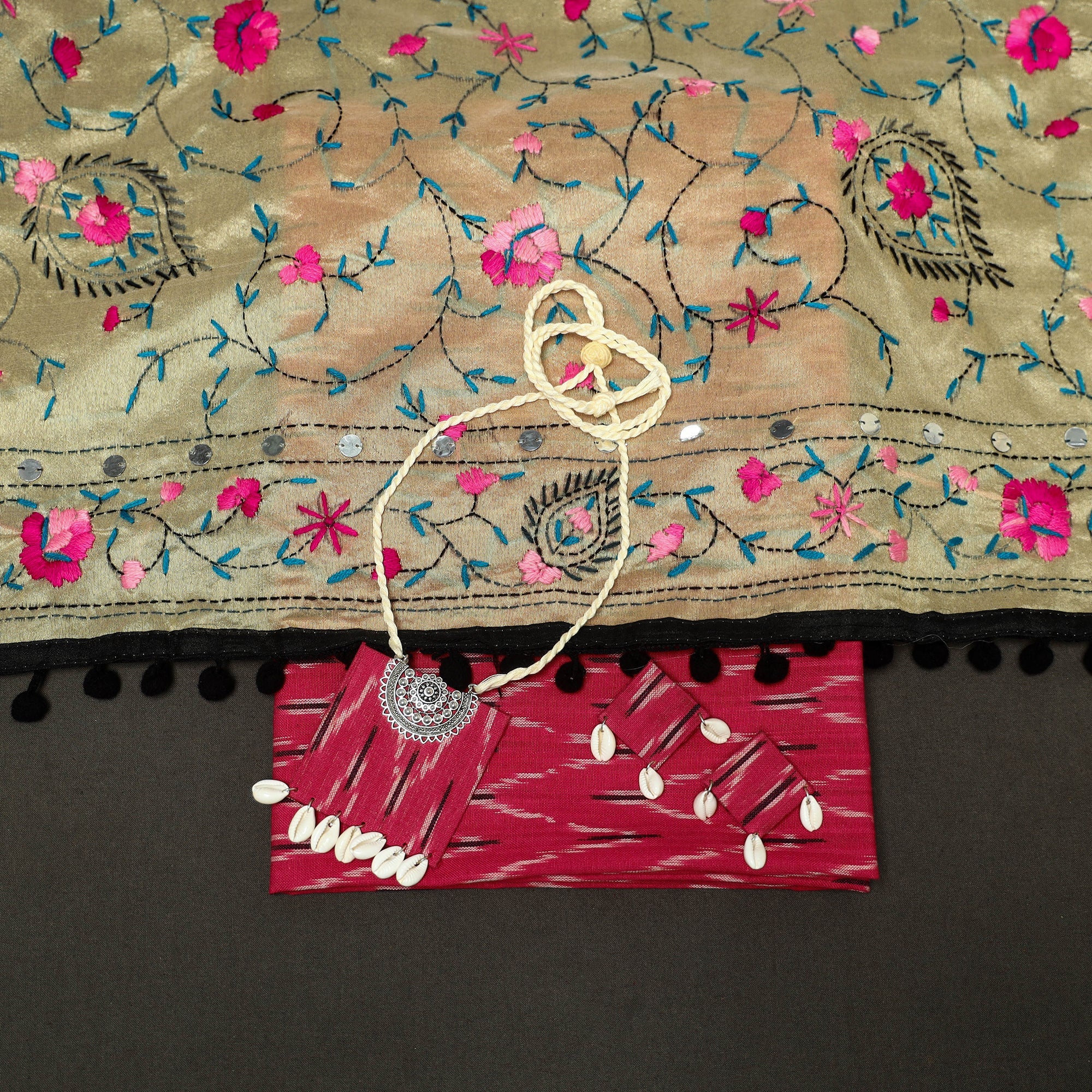 This pink 2pc set presents a pochampally Ikat cotton kurta complemented by a chanderi silk dupatta detailed with traditional phulkari embroidery. A coordinated necklace and earrings complete the attire, giving it an elegant ethnic touch. Perfect for festive gatherings as well as casual moments, it offers a graceful balance of heritage and comfort, making it equally suited for gifting or personal wear.