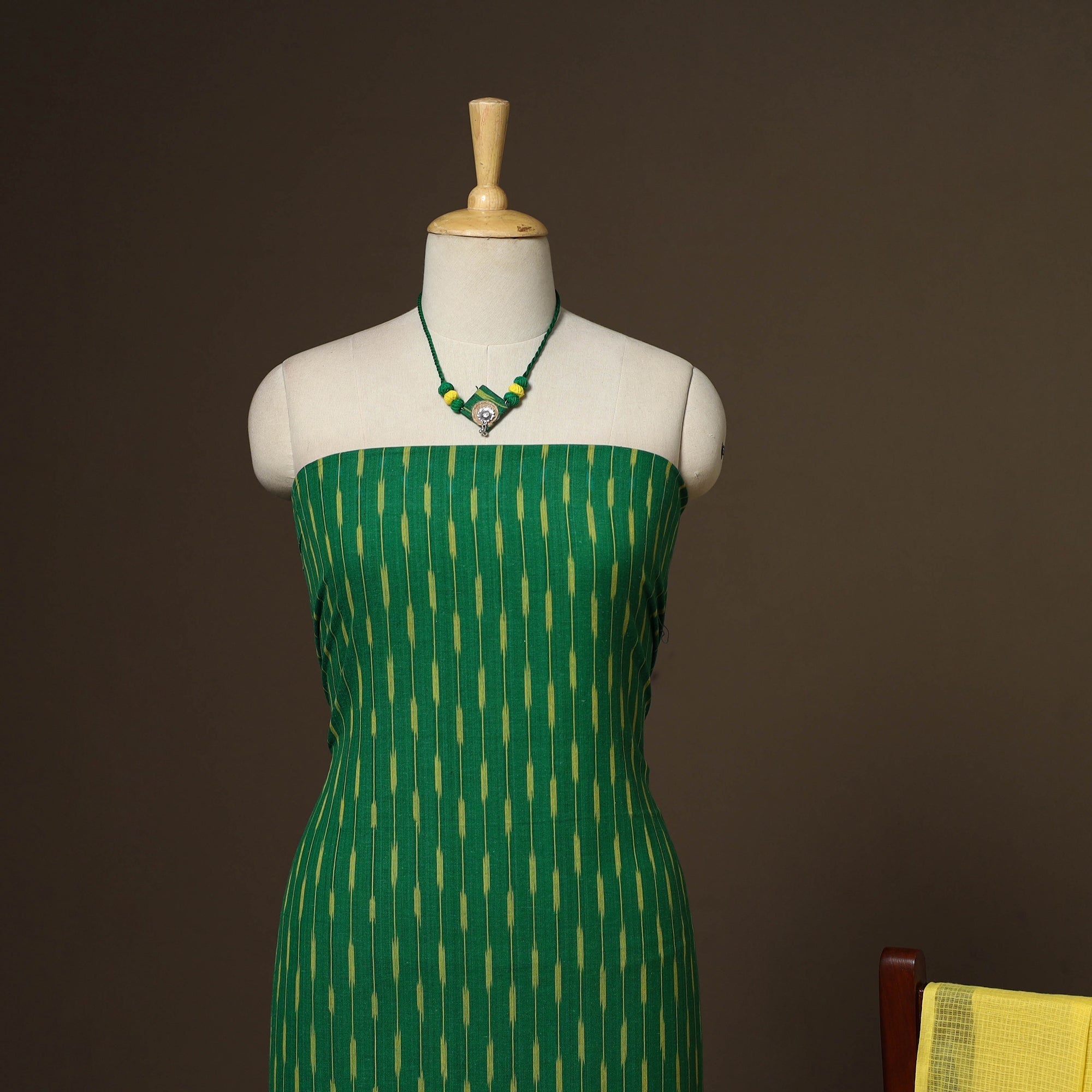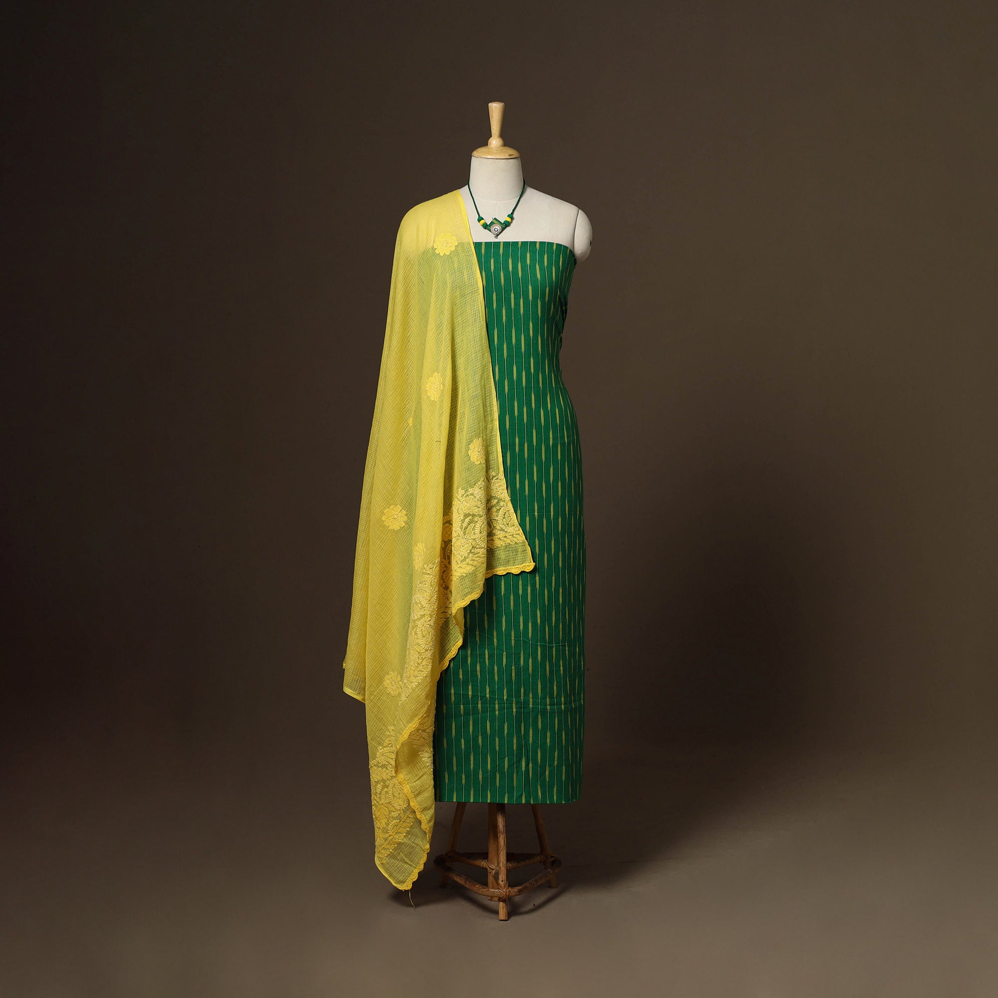 Traditional green 2pc unstitched dress material set to your wardrobe. It includes a pochampally ikat weave cotton kurta fabric, paired with a lucknowi chikankari hand embroidered kota doria cotton dupatta. The set also comes with a handcrafted necklace and matching earrings to complete your look, perfect for festive events, family gatherings or special occasions.