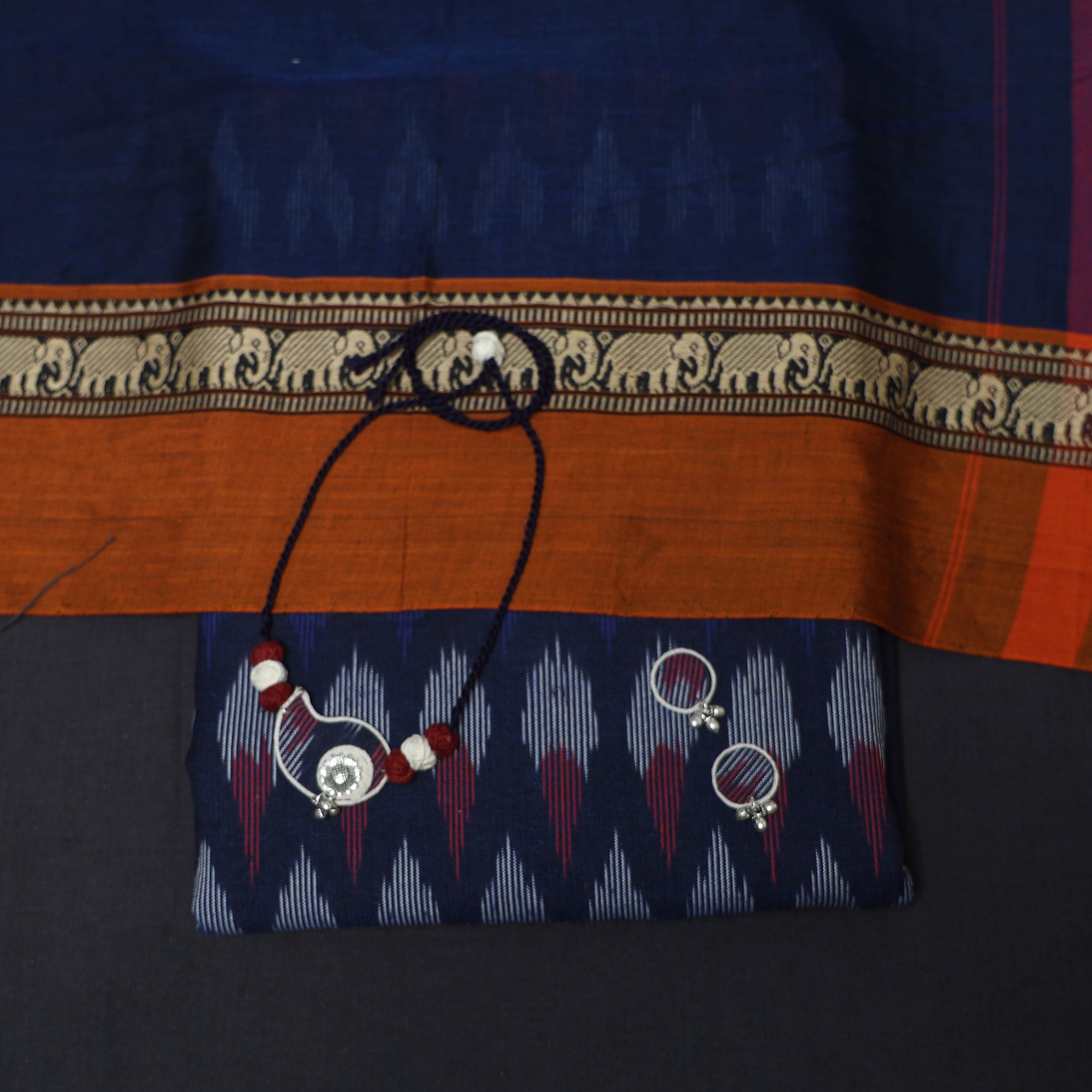This blue 2pc set includes a pochampally Ikat cotton kurta paired with a dharwad cotton dupatta. It comes with matching necklace and earrings, adding refined ethnic charm to the look. Designed for both festive elegance and everyday comfort, it’s perfect for daily wear or as a meaningful gift, beautifully balancing tradition with modern grace.