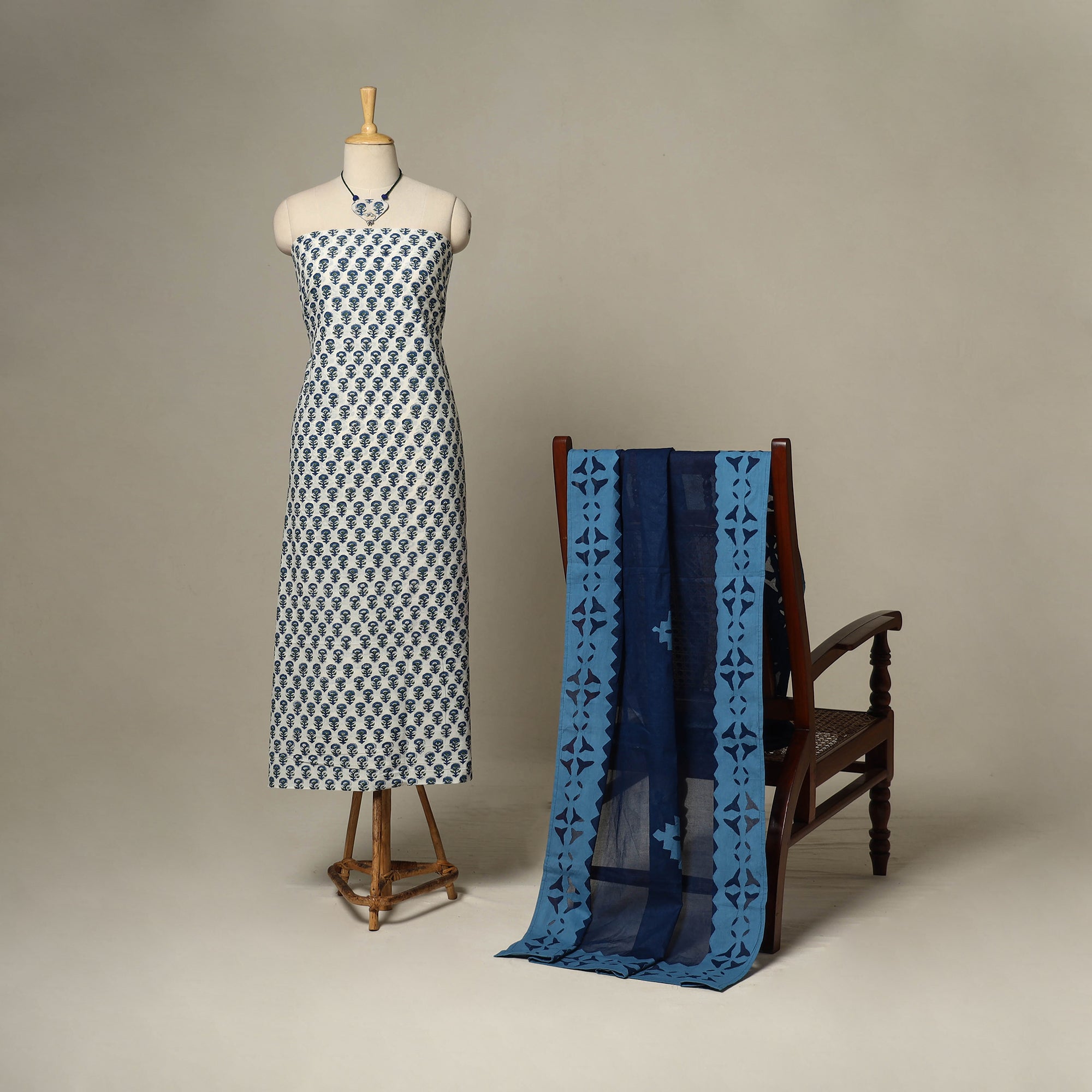 This white 2pc set includes a sanganeri block print cotton kurta paired with an applique cotton dupatta. It comes with matching necklace and earrings, adding refined ethnic charm to the look. Designed for both festive elegance and everyday comfort, it’s perfect for daily wear or as a meaningful gift, beautifully balancing tradition with modern grace.