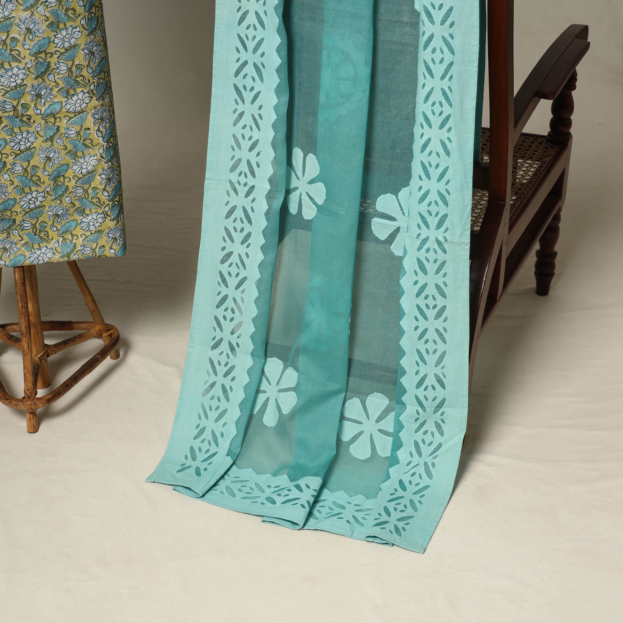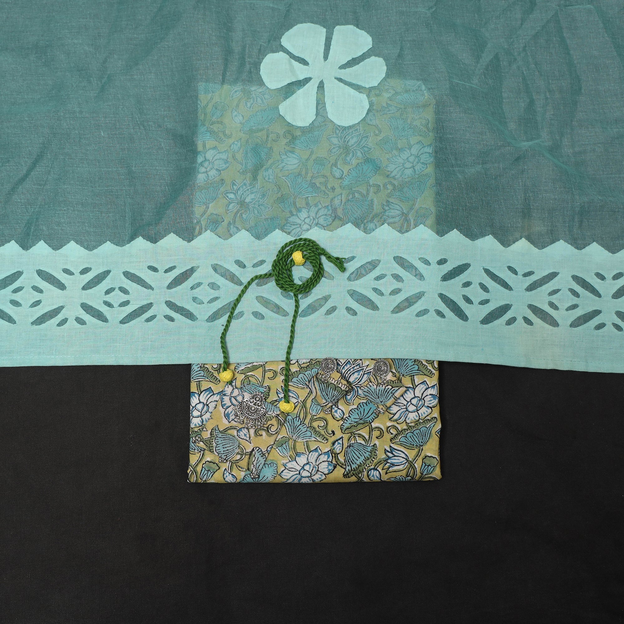 This green 2pc set includes a sanganeri block print cotton kurta paired with an applique cotton dupatta. It comes with matching necklace and earrings, adding refined ethnic charm to the look. Designed for both festive elegance and everyday comfort, it’s perfect for daily wear or as a meaningful gift, beautifully balancing tradition with modern grace.