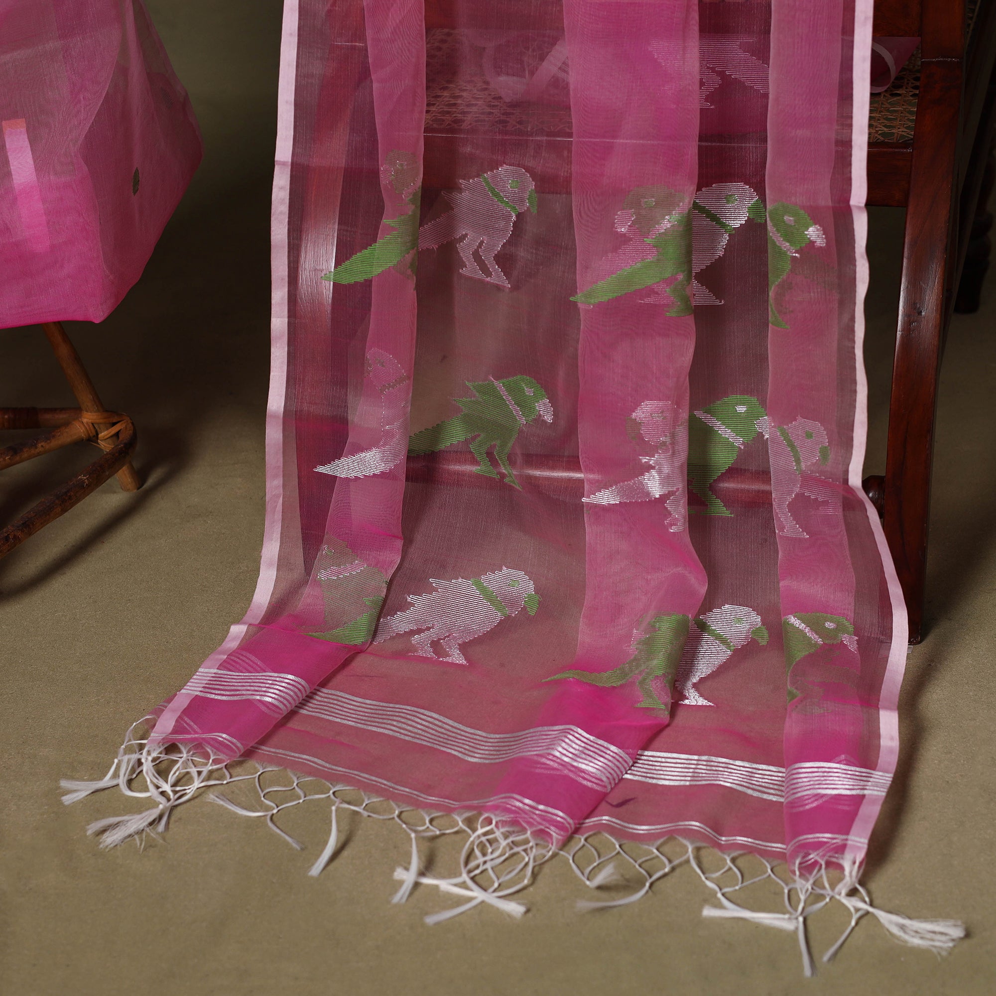 Celebrate Bengal’s weaving heritage with this pink 2pc phulia jamdani handloom mulberry silk dress material. Woven using the extra-weft technique, the butis resemble embroidery. The method mirrors tapestry work, with small shuttles of coloured, gold, or silver threads passed through the warp. Known for its intricate patterns, Jamdani is time-intensive. Includes kurta fabric and a tassel-detailed dupatta, perfect for daily wear or festive looks.
